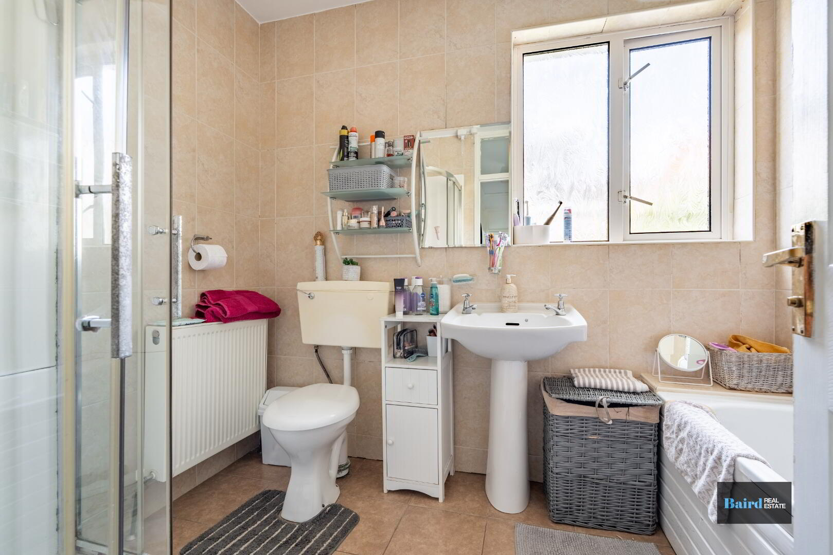 Tiled flooring, fully tiled walls, white ceramic WC and wash hand basin, bath, shower with electric shower unit.