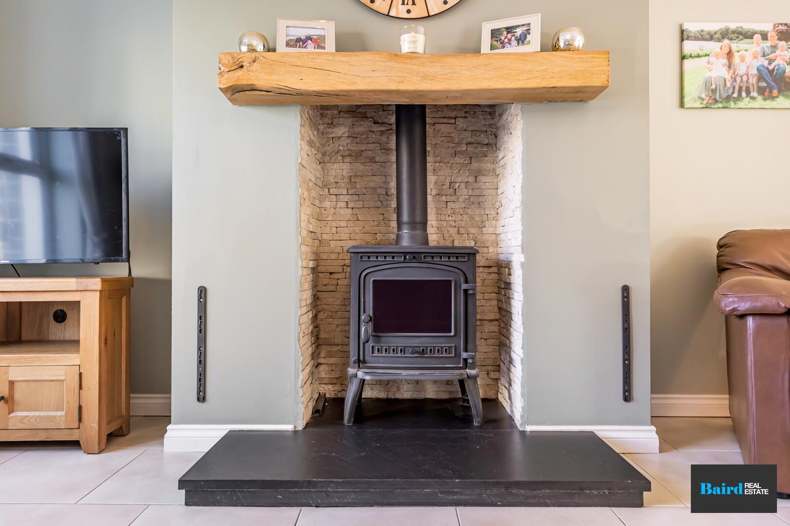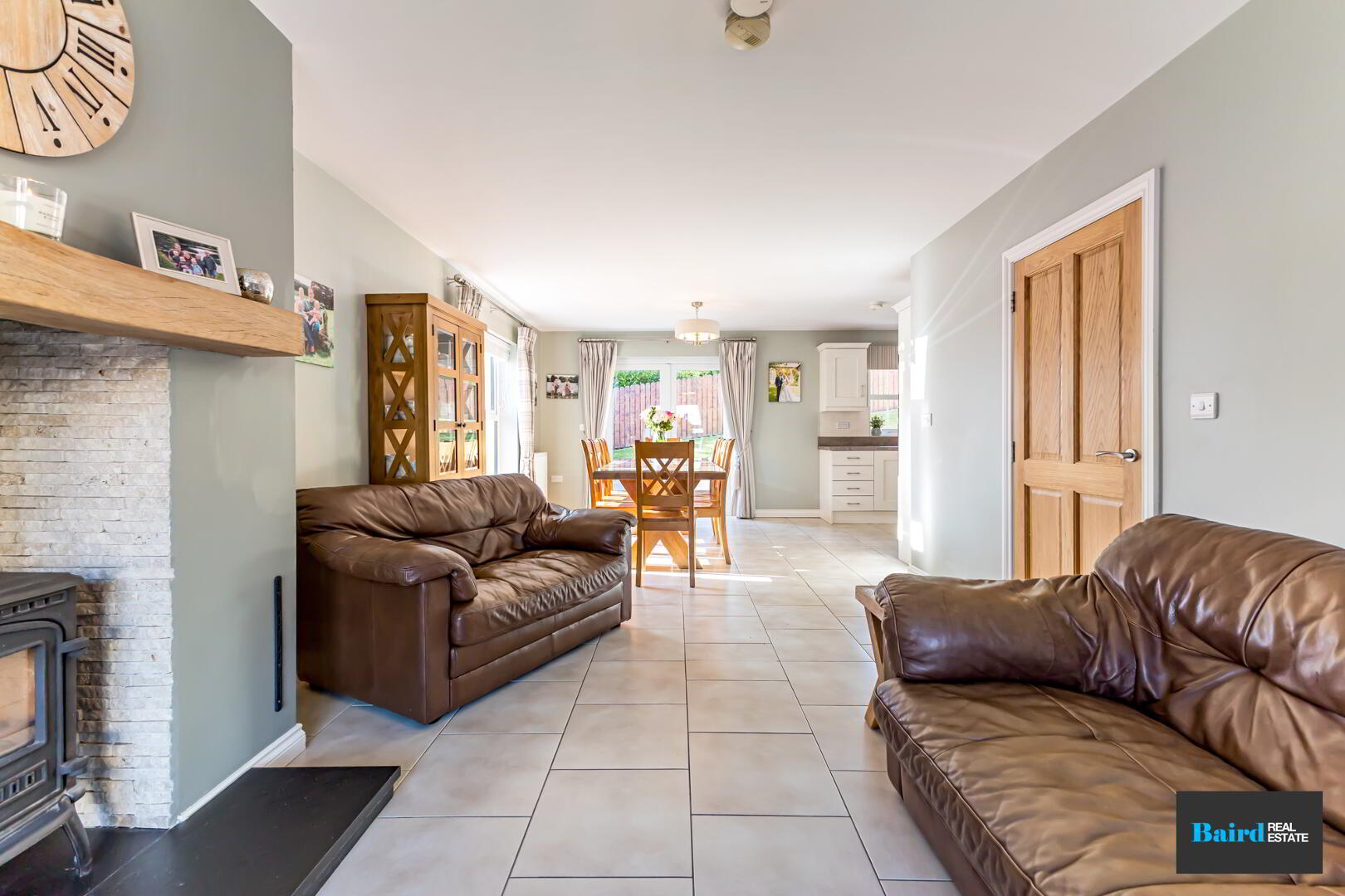 Tiled flooring, two double panel radiators, power points, TV point, fireplace with slate hearth, stone clad inset on wall and wooden mantle, wood burning stove, double patio Pvc doors to back garden, opens up to the kitchen.