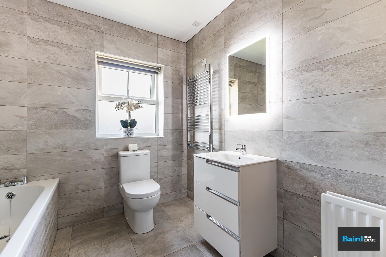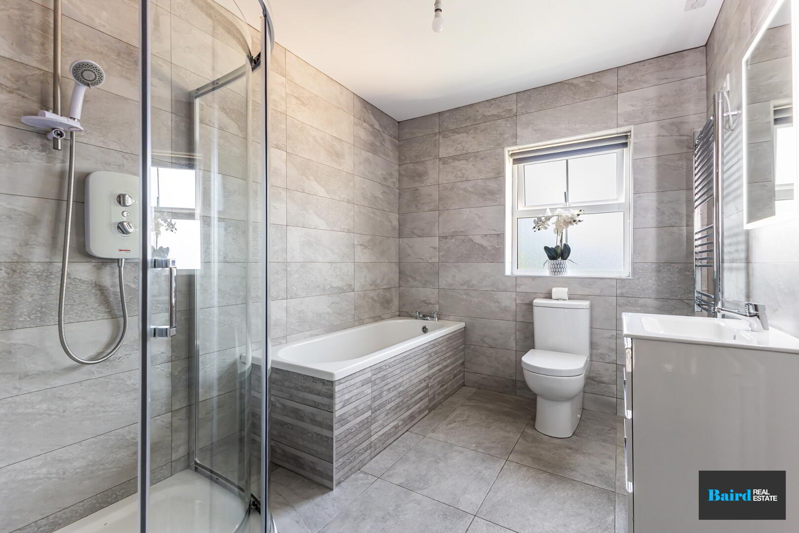 Tiled flooring, fully tiled walls, double panel radiator, wall mounted chrome heated towel rail, white ceramic WC and wash hand basin with vanity unit, wall mounted mirror with lighting, bath with tiled panel, corner shower with Redring electric shower units, extractor fan.