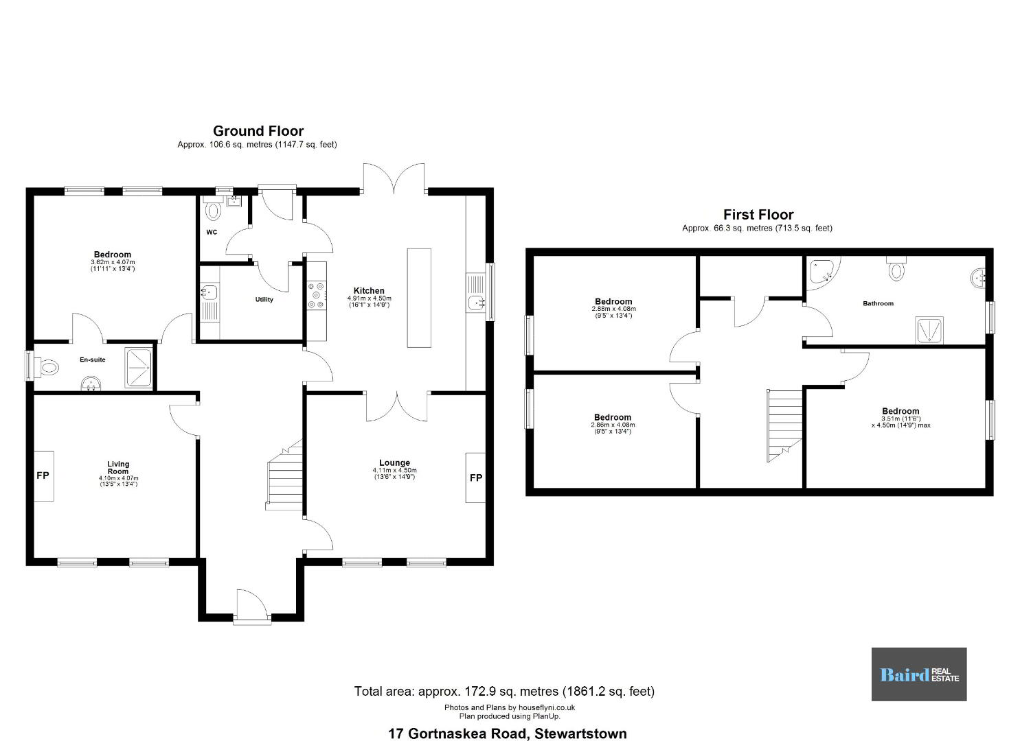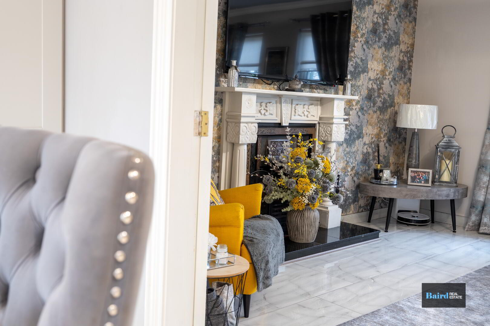 The ground floor comprises a bright and welcoming entrance hallway, a stylish living room featuring a media wall with electric fire, and a separate lounge with open fire, providing flexible living and entertaining space. The heart of the home is the impressive kitchen, fitted with a range of high and low-level units, quartz worktops, integrated appliances, Qooker tap and a centre island, with double patio doors opening to the rear yard. A rear hallway, downstairs WC, utility room and a master bedroom with en-suite shower room complete the ground floor accommodation.