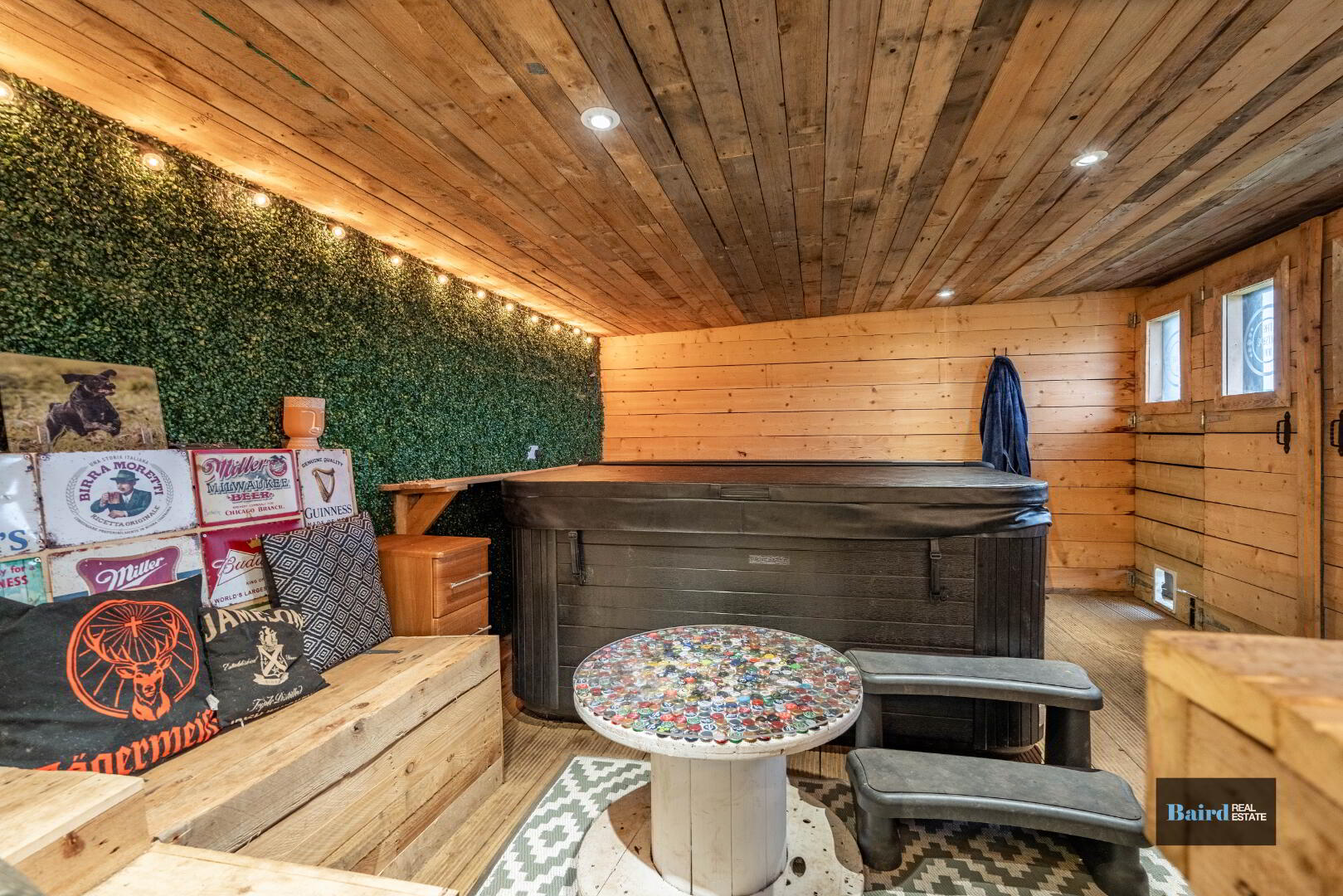 Folding wooden doors, wooden ceiling with spotlights, built-in bar and storage, power points and TV points, toilet and whb area.