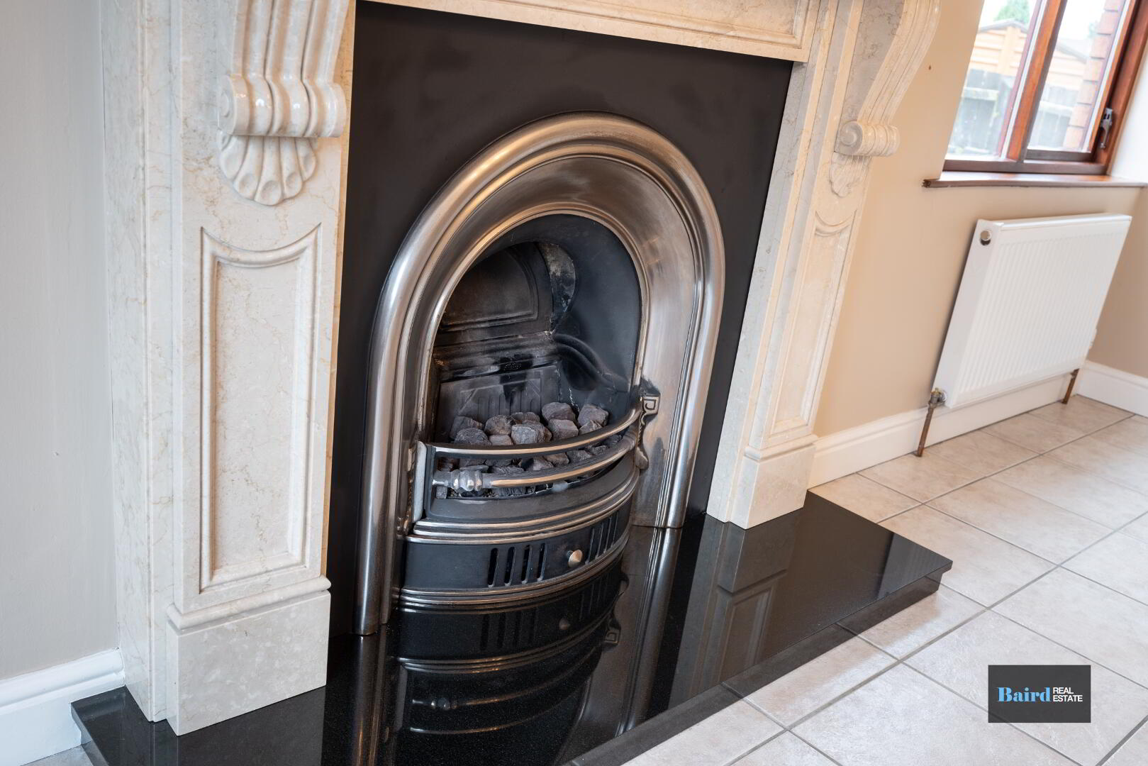 Tiled flooring, power points, TV points, single panel radiator, double panel radiator, gas fireplace with granite hearth and marble surround, coving, double French doors from the hallway.