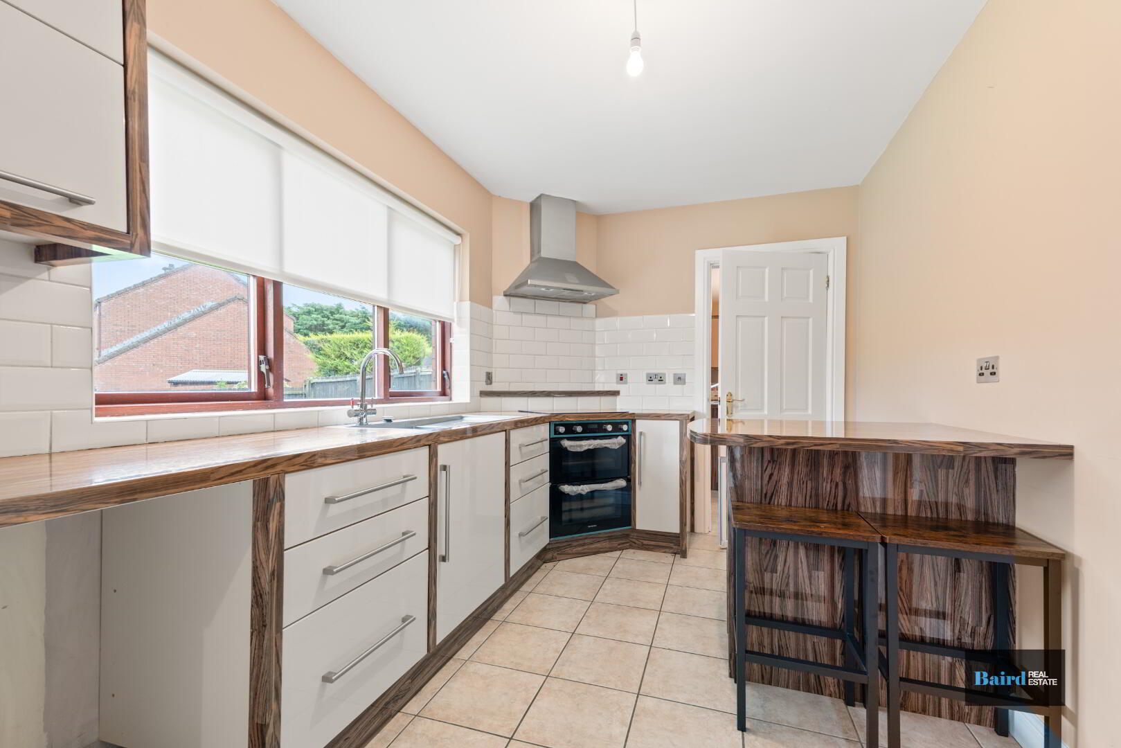 Tiled flooring, double panel radiator, high and low level storage units, wood frame back door, plumbed for washing machine and space for dryer, 1 bowl stainless stainless.