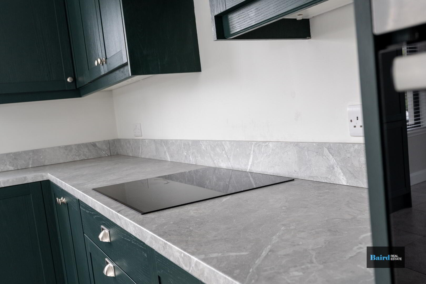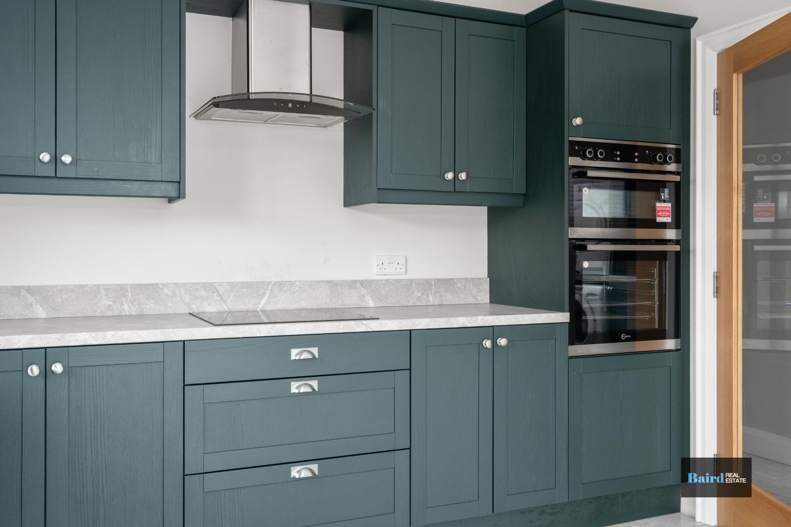 Tiled flooring, double panel radiator, double pvc patio doors, power points, spot lighting, range of high and low level kitchen storage units, integrated fridge and freezer, integrated Nordemende dishwasher, 1.5 bowl stainless steel sink, integrated Nordemende four ring electric hob and extractor fan, integrated flavel electric fan oven and grill.