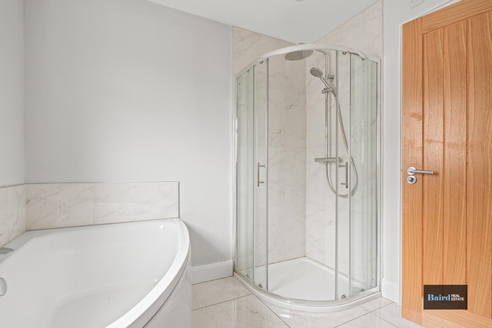 Tiled flooring, corner bath with tiled splashback, white ceramic wc and wash hand basin with storage and tiled splashback, chrome heated towel rail, corner shower with fully tiled walls and dual headed mains shower.