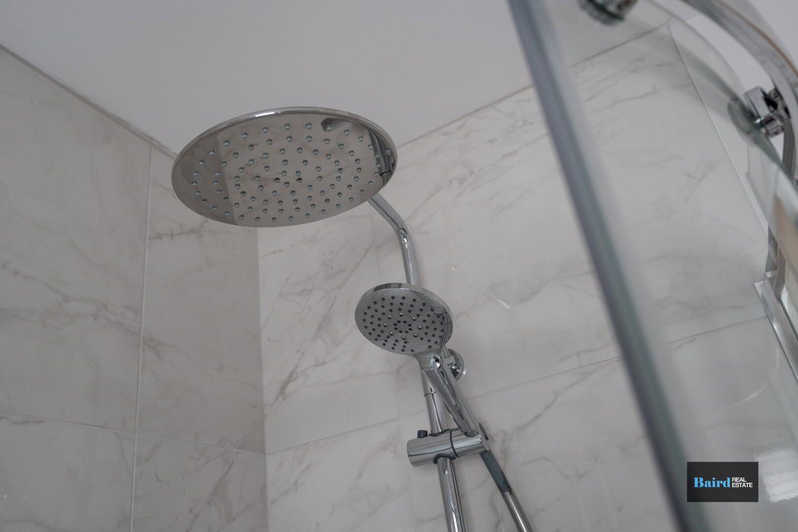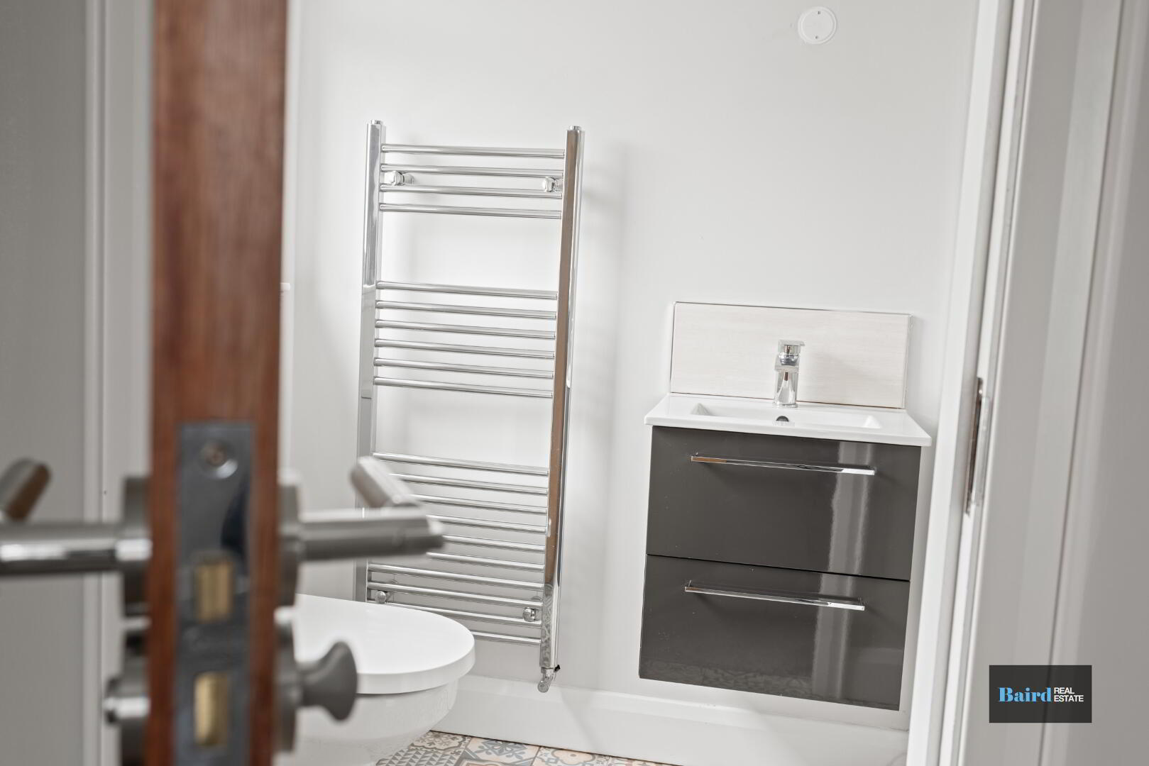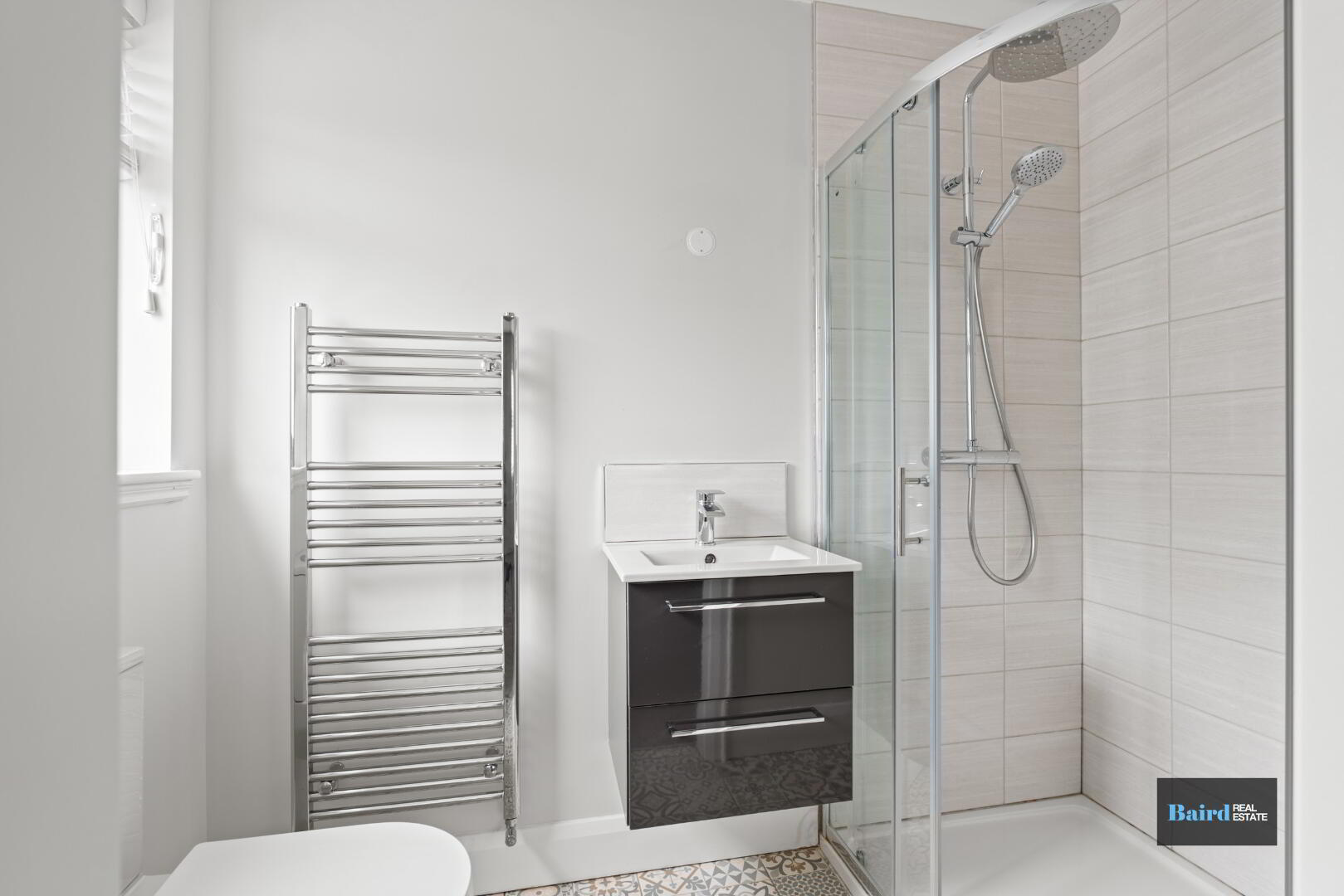 Decorative tiled flooring, white ceramic WC and wash hand basin with storage, chrome heated towel rail, tiled splashback, extractor fan, corner shower with dual headed mains shower and fully tiled walls at shower.