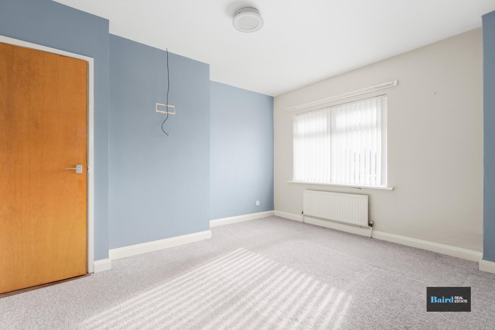 Carpet flooring, double panel radiator and power points.