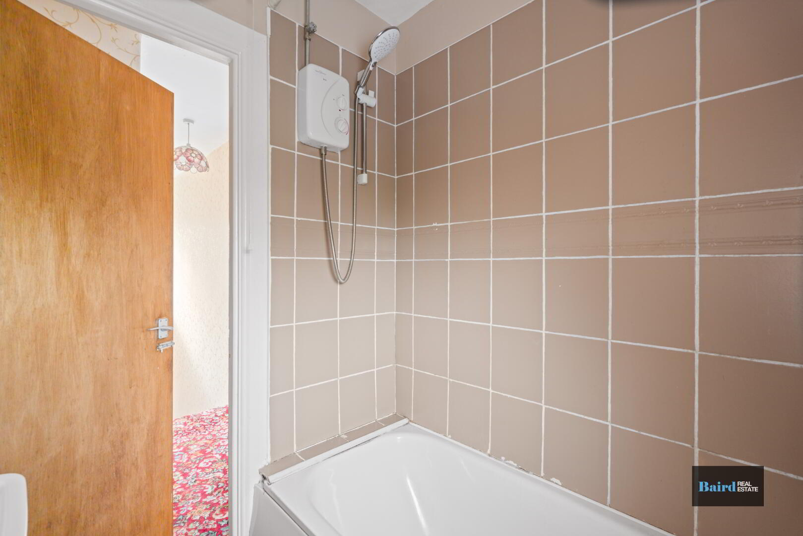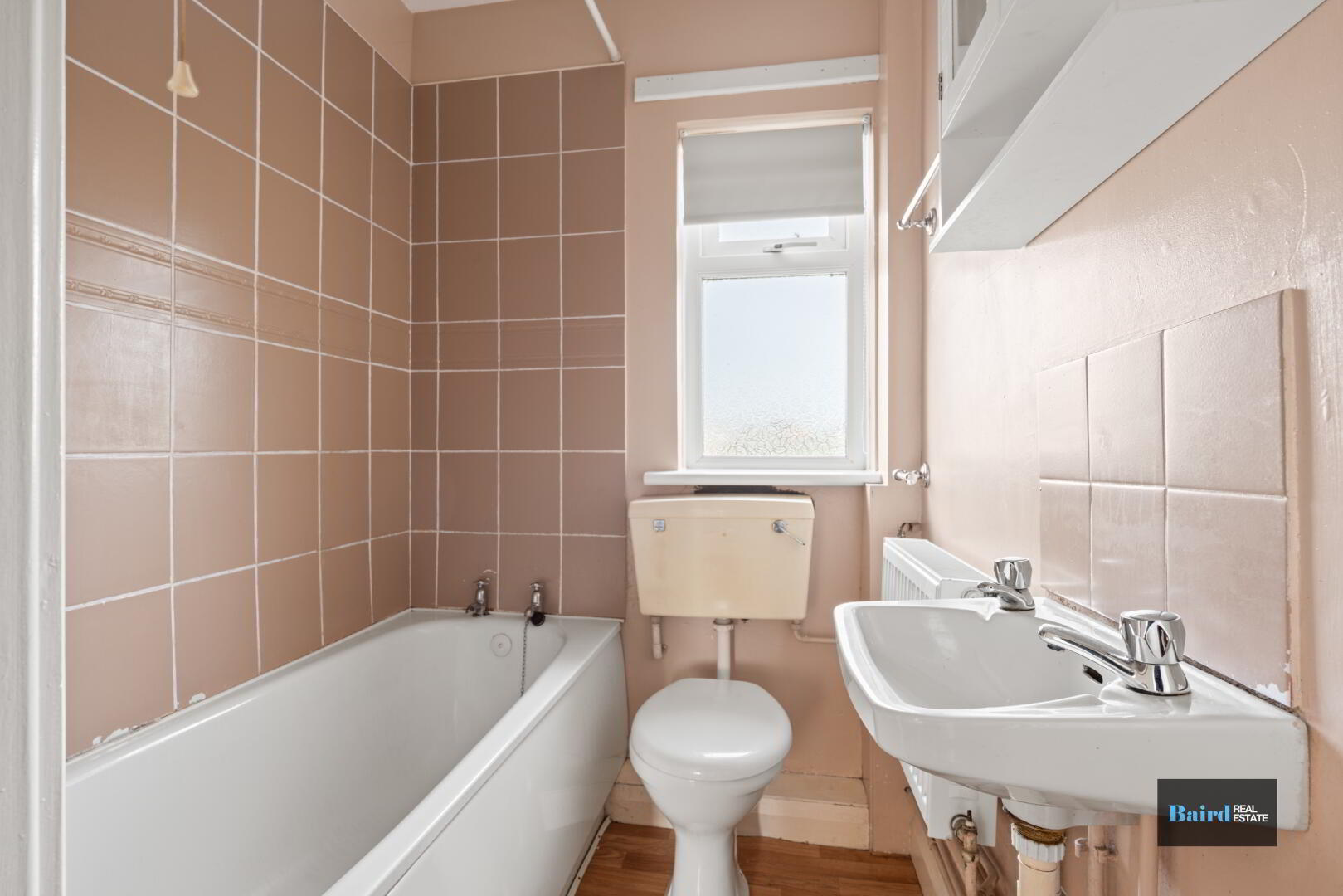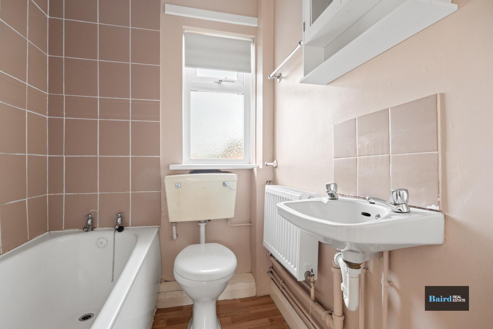 Laminate flooring, tiled walls above bath, bath shower unit, single panel radiator, rear facing window and floating wash hand basin.