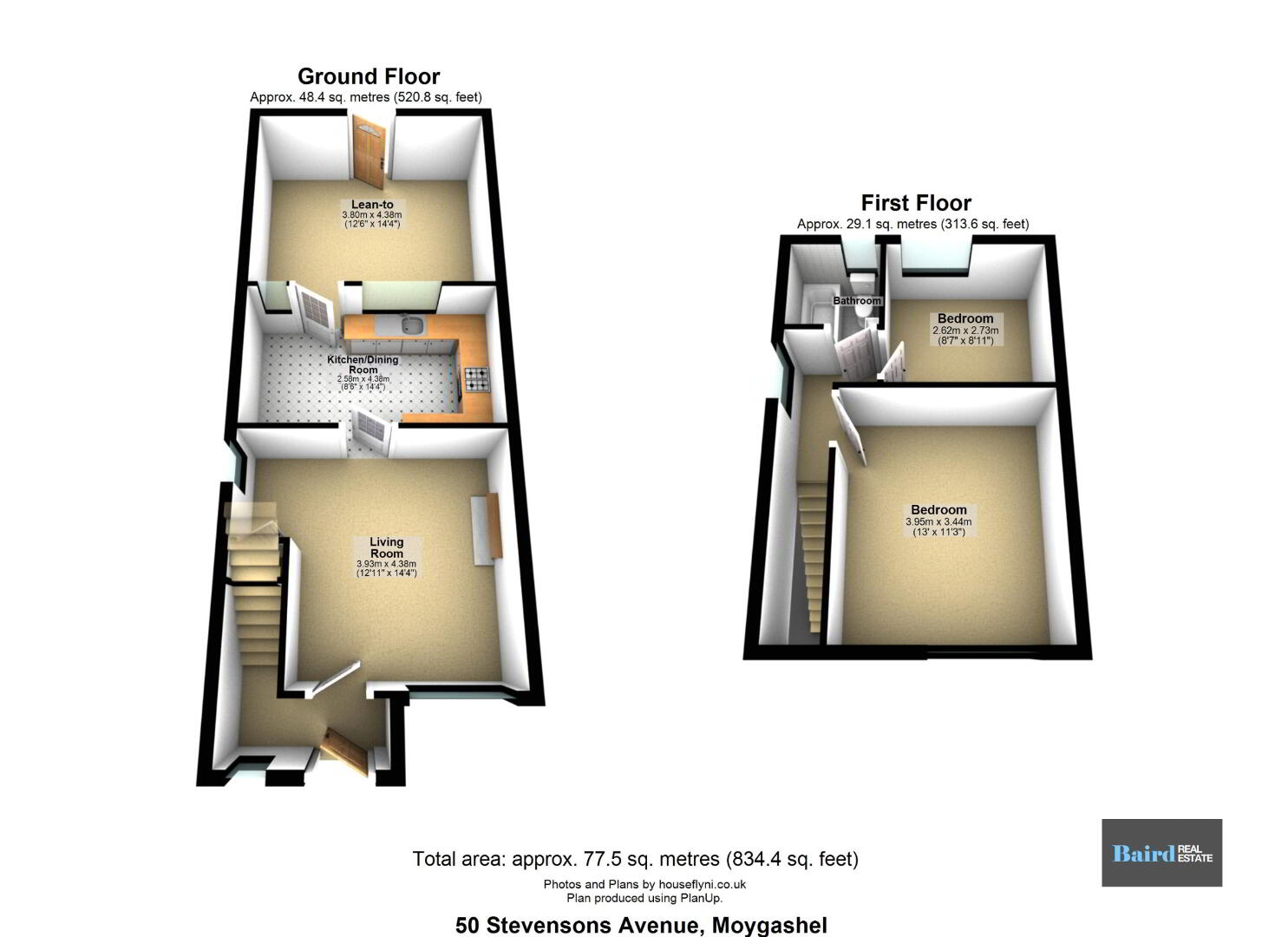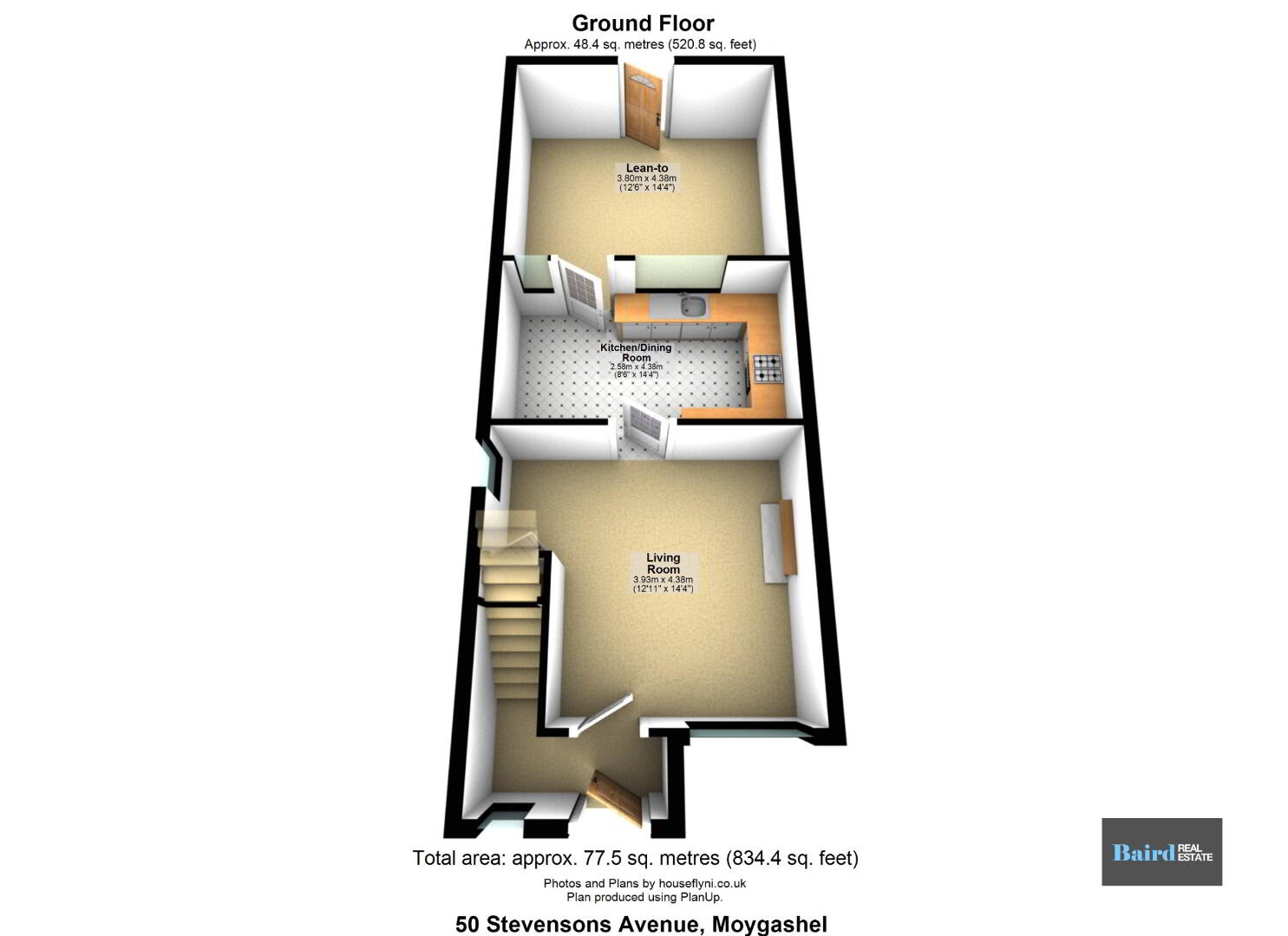 Internally, the accommodation comprises a bright living room, a separate kitchen/diner, and a lean-to area providing useful cover over the rear yard space. On the first floor, there are two well-proportioned bedrooms and a family bathroom.