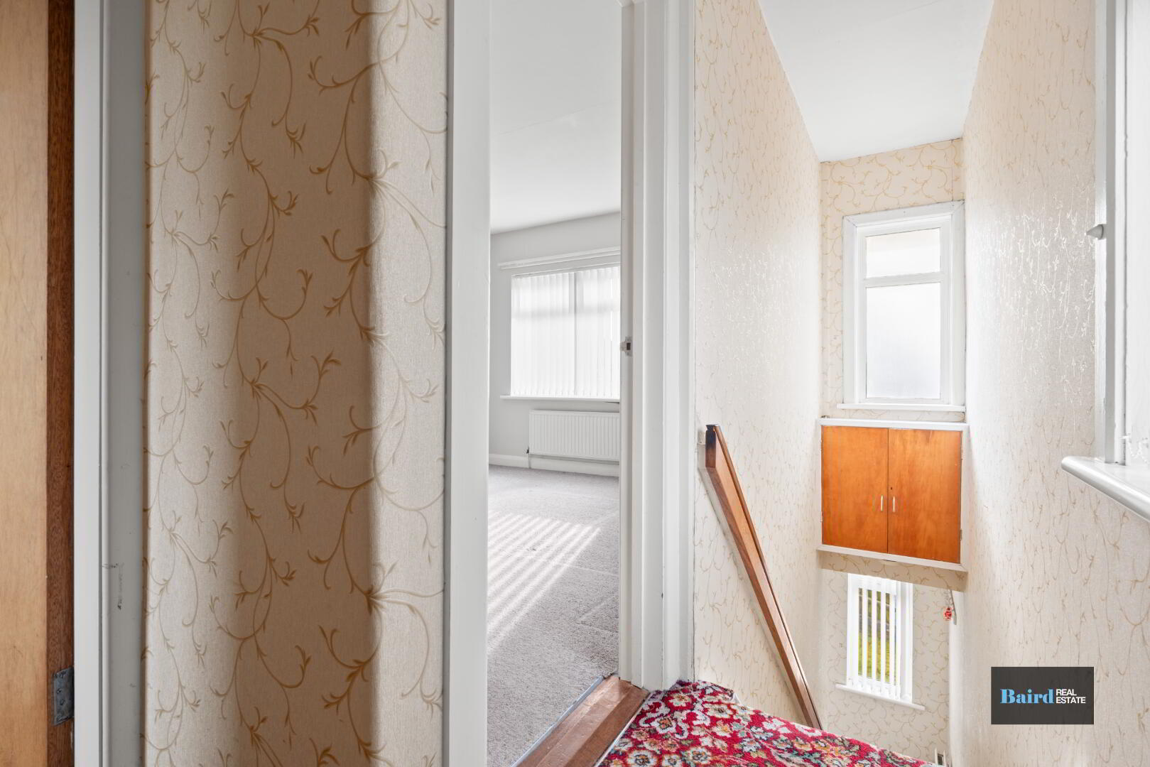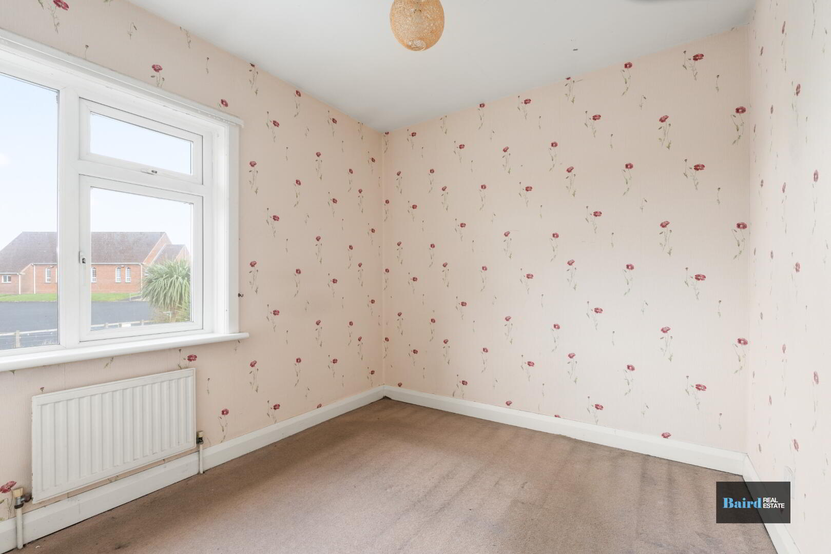 Carpet flooring and single panel radiator.