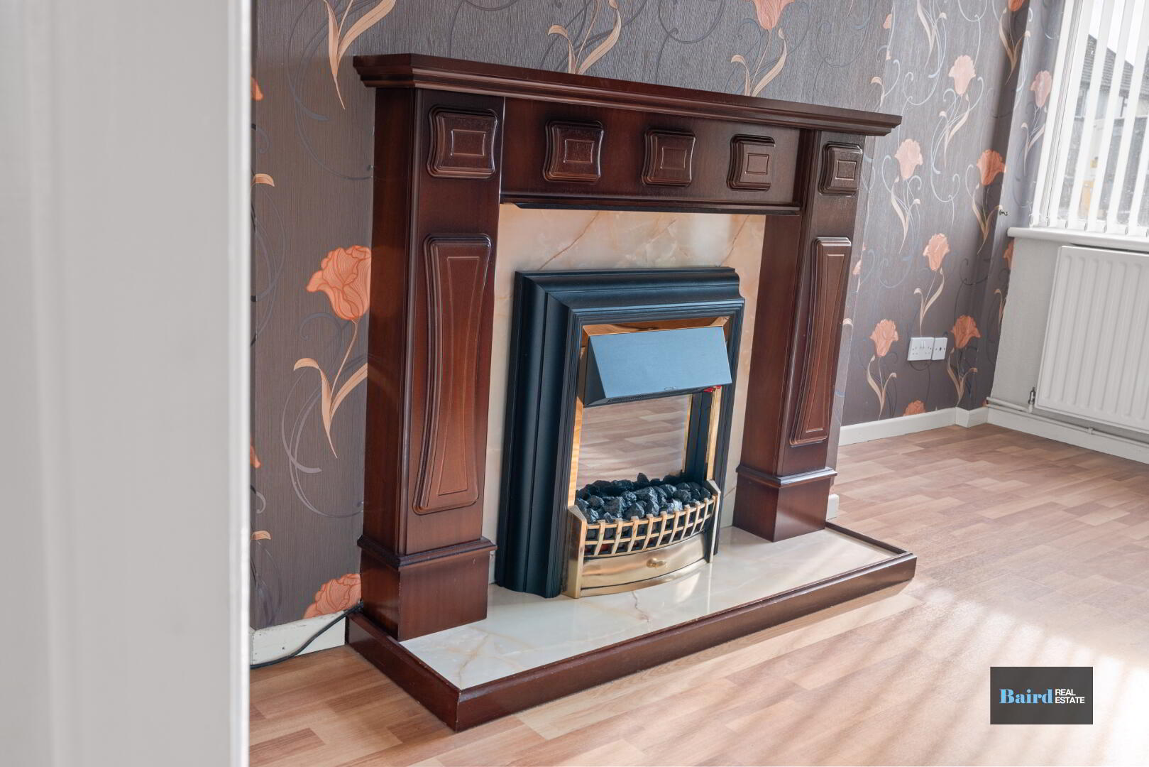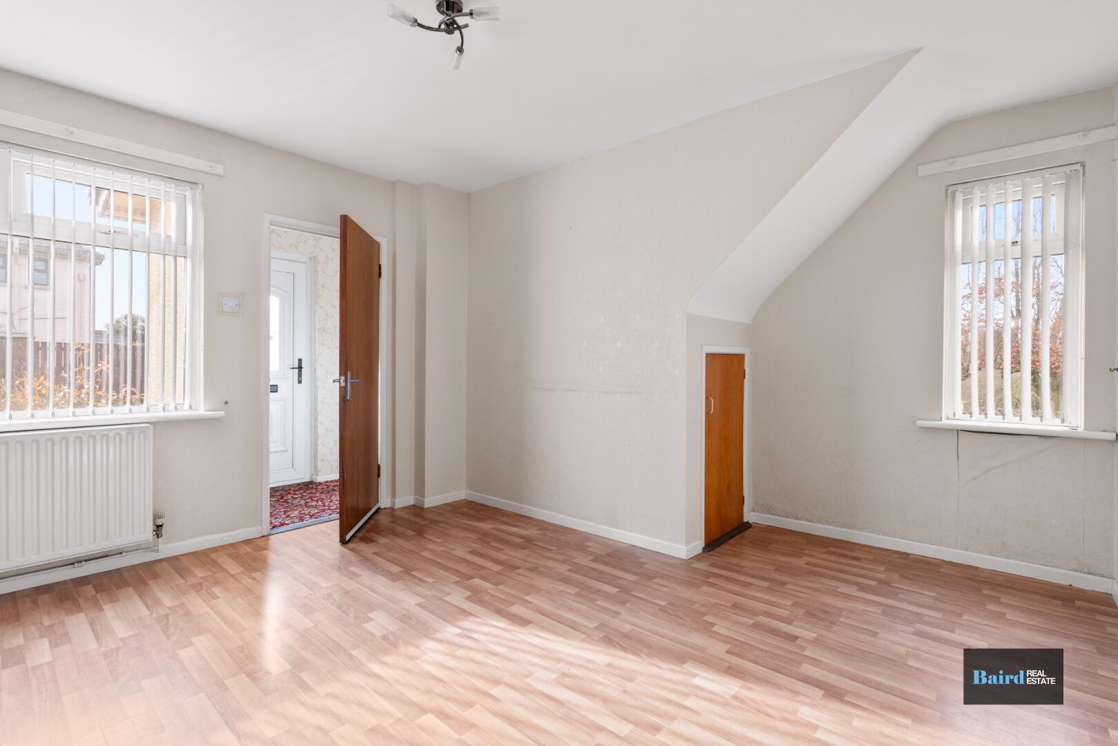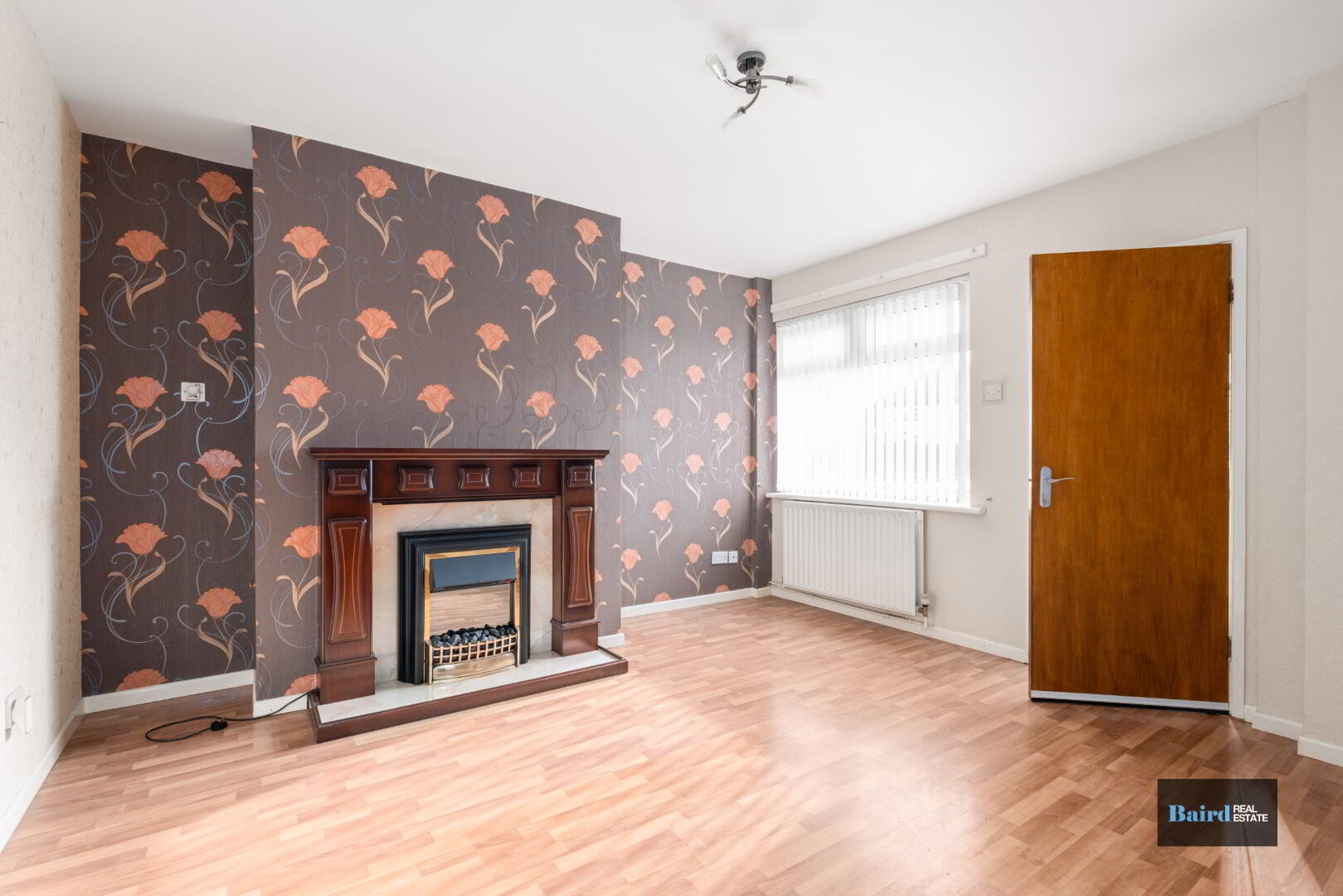 Laminate wooden flooring, open fire with granite hearth, mahagony surround and electric inset, power points, double panel radiator, front and side aspect windows and understairs storage.