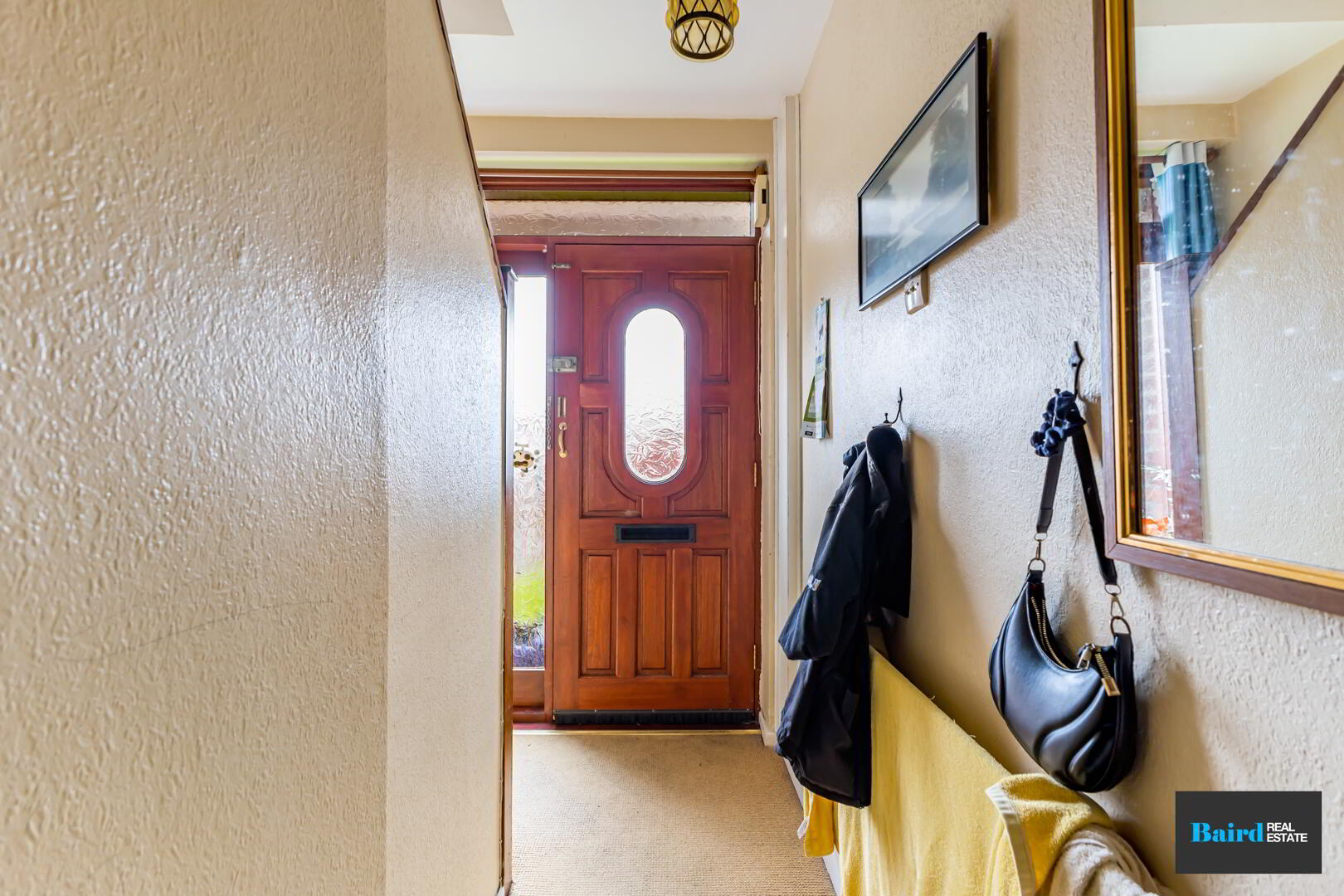 Carpeted, leading to stairway which is carpeted, single panel radiator, power point and wood frame front door with side glazed panels.
