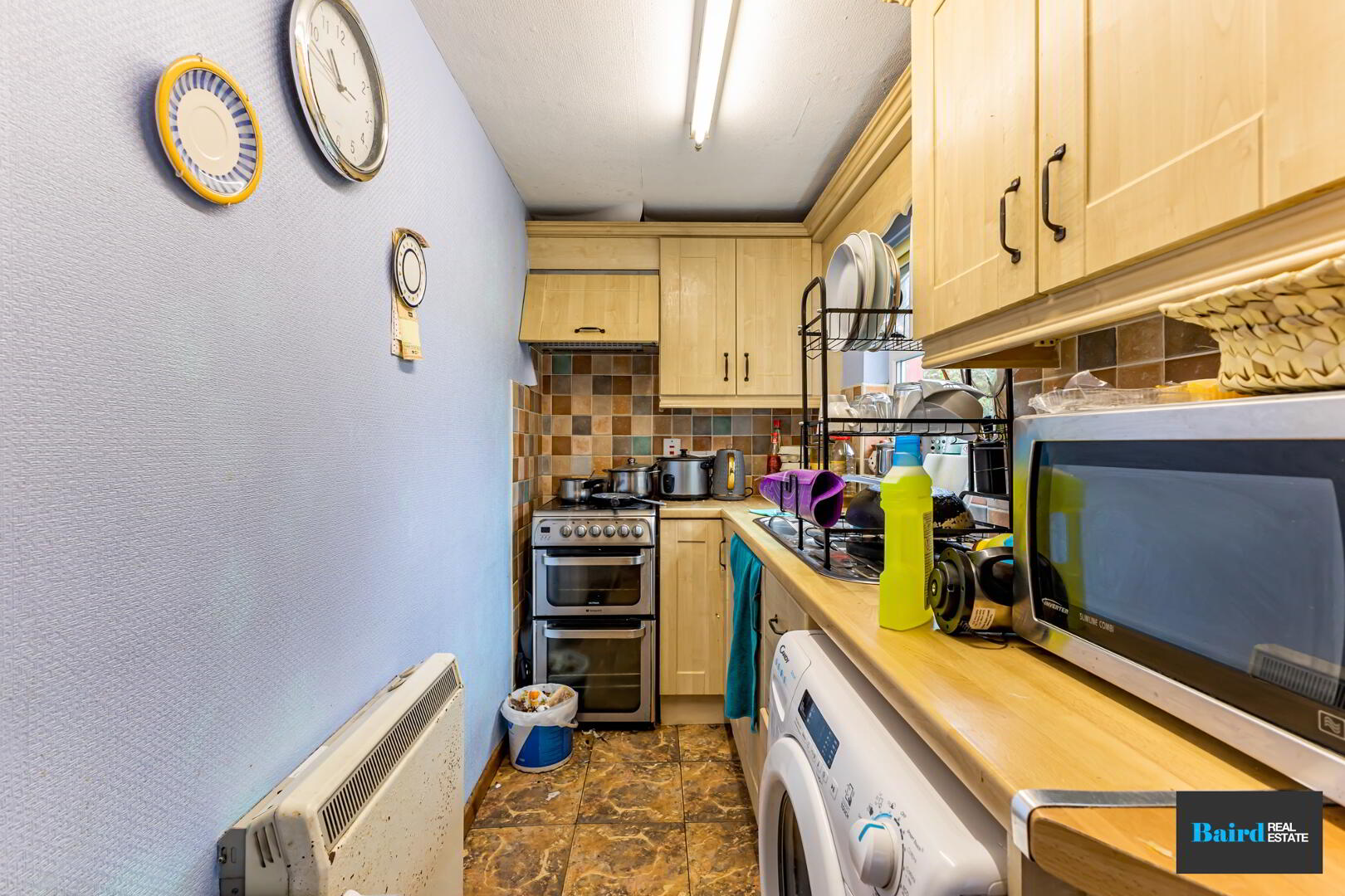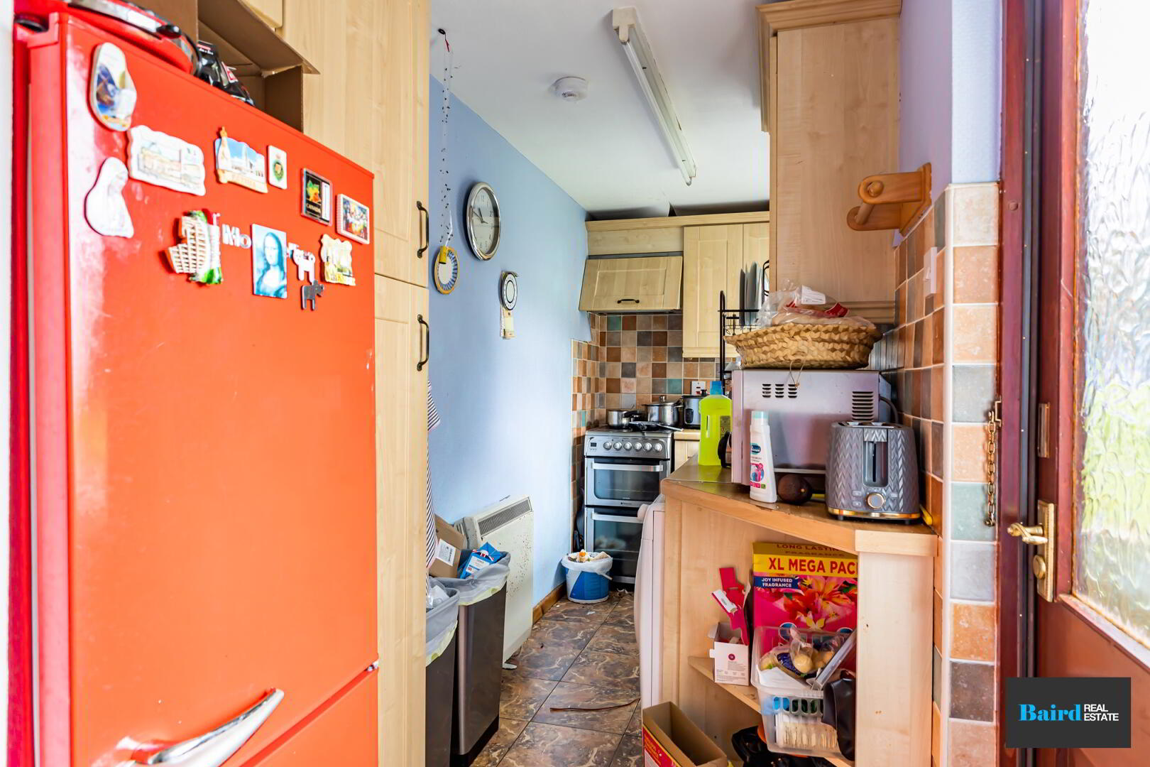 Wooden frame door to back garden, Elexrrix storage heater, range of high and low level, kitchen storage units, plumbed for washing machine, space for electric oven, extractor hood,