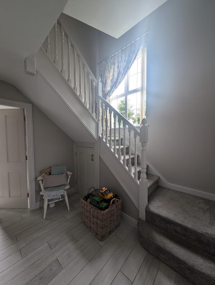 Tiled flooring, radiator, wood frame front door, power points, leading to stairway which is carpeted, under stairs storage, power points.