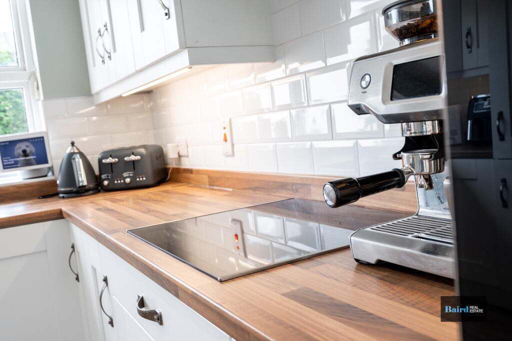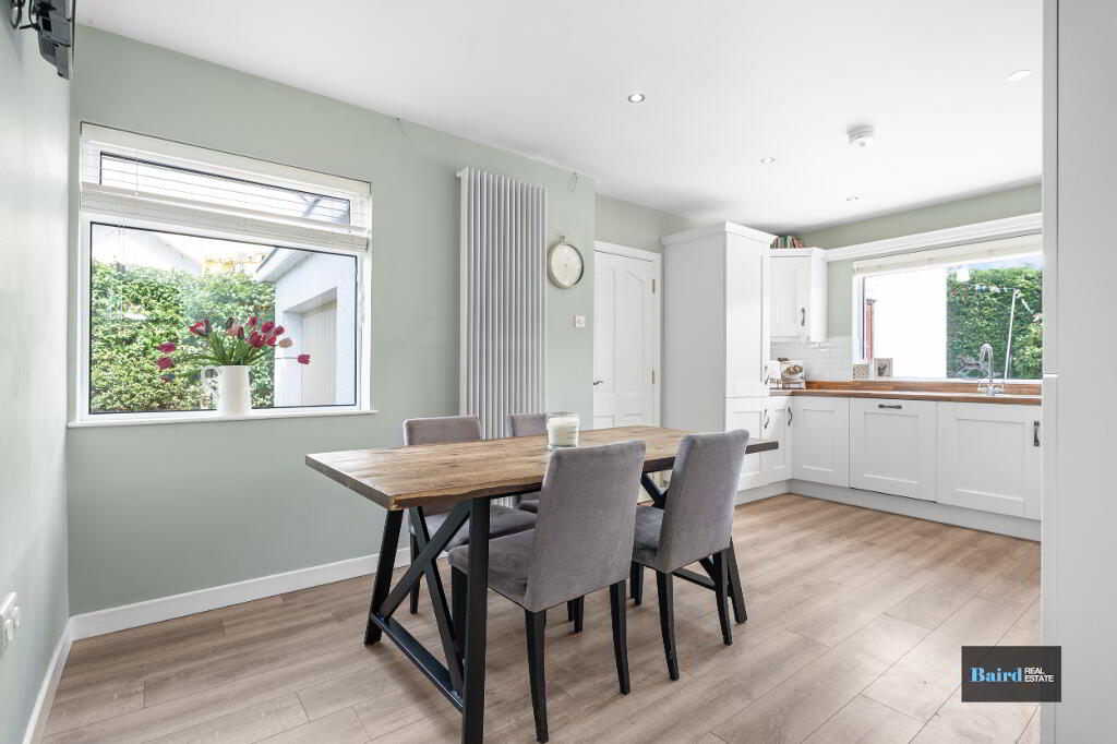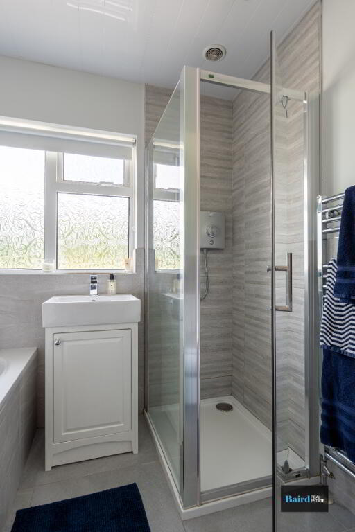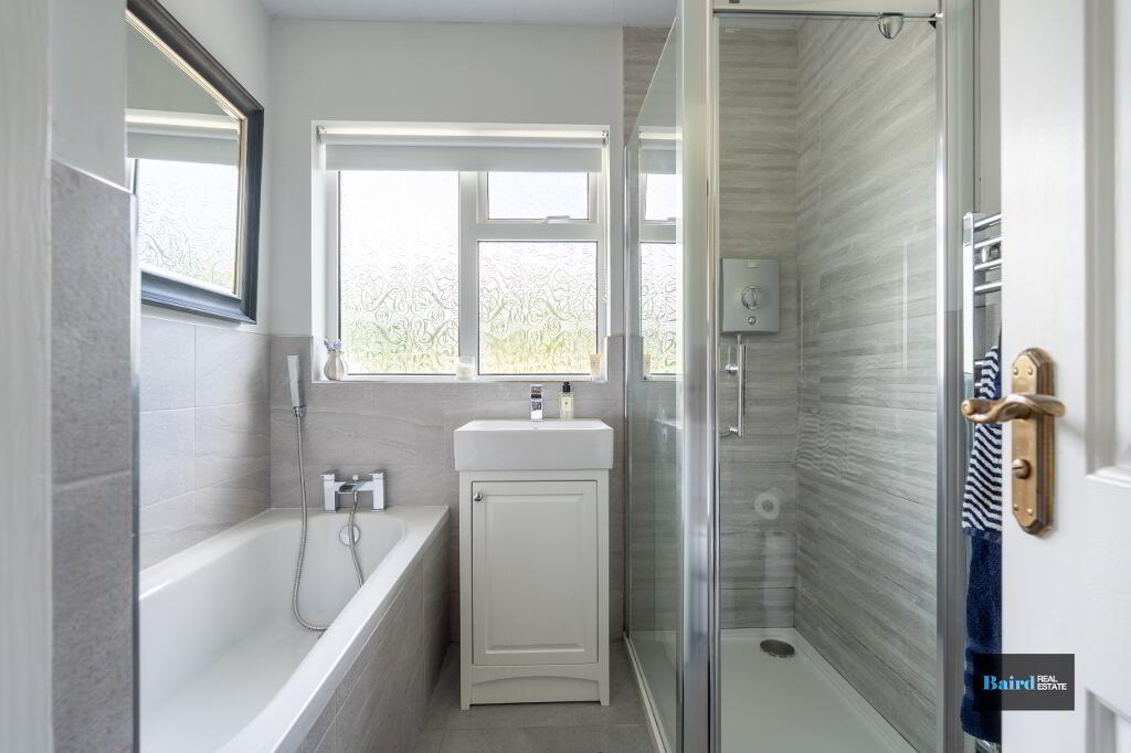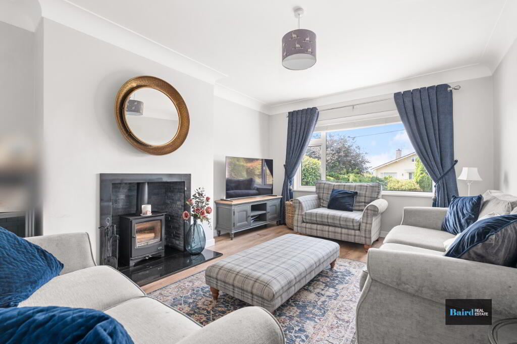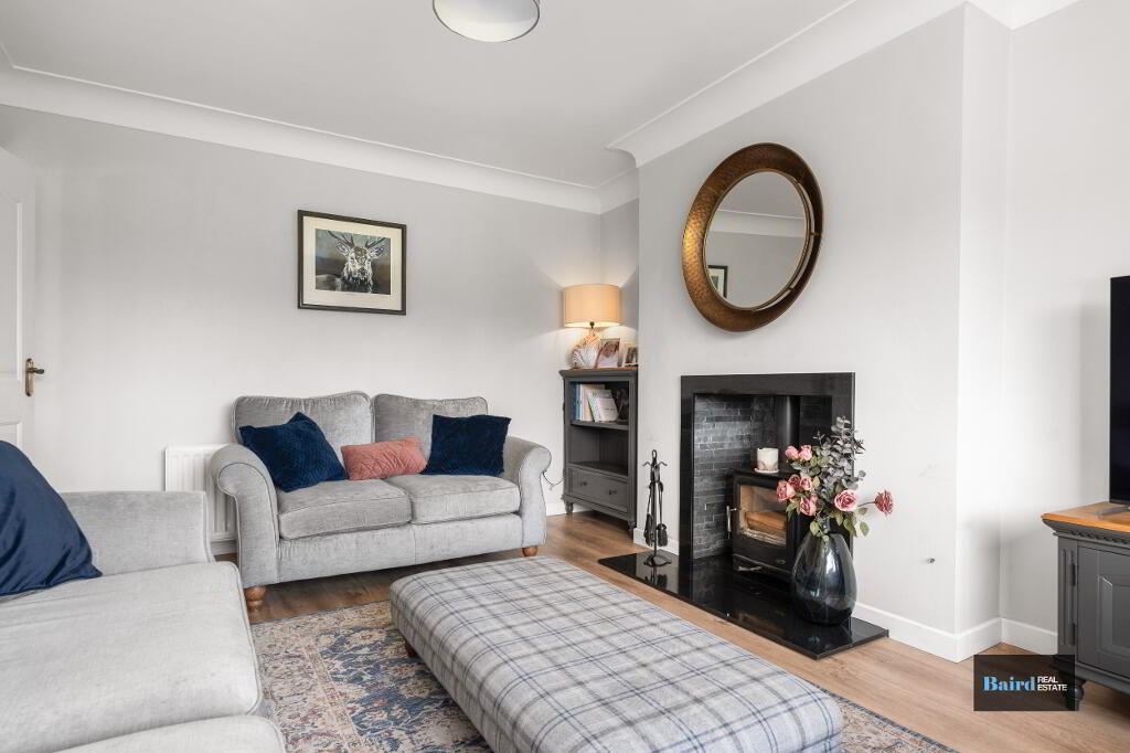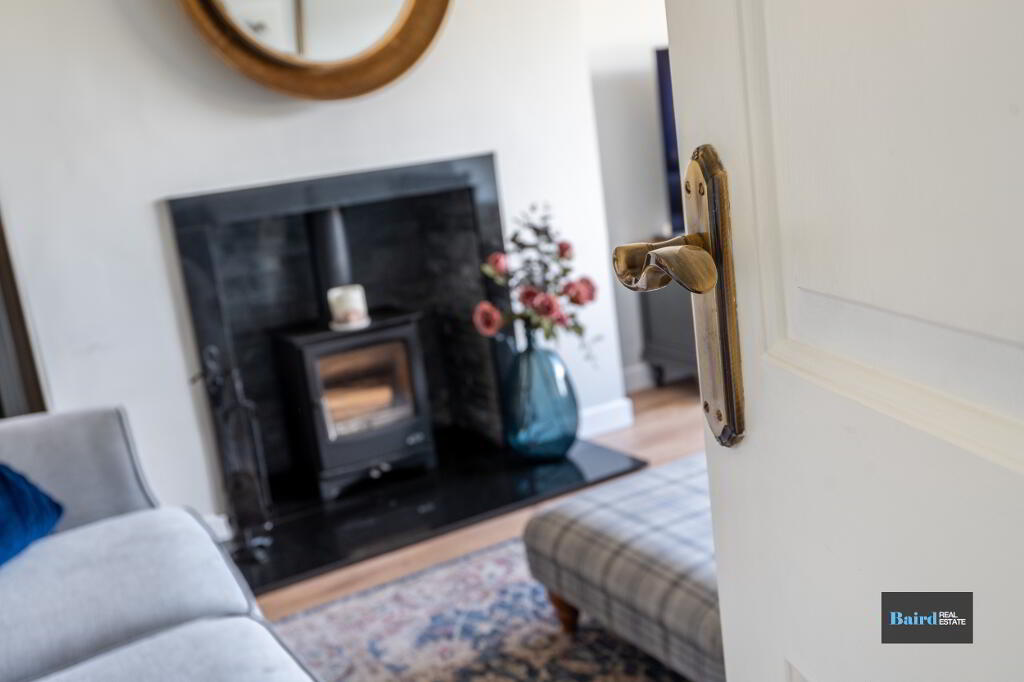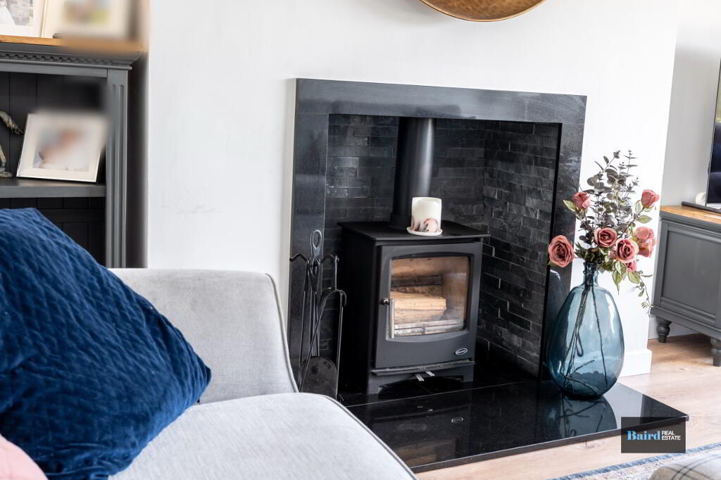 Internally, the home has been tastefully modernised in recent years to an exceptional standard. Accommodation comprises a bright and spacious kitchen/dining area with integrated appliances, two generous reception rooms — one featuring an open fireplace and the other a cosy wood-burning stove — as well as a contemporary family bathroom with both a bath and separate shower.