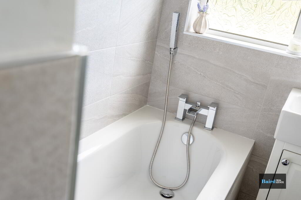 Tiled flooring, Half tiled walls, Bath with tiled panels, White ceramic wash hand basin with storage, White ceramic WC, Extractor fan, Shower with awualisa electric shower unit, Chrome heated towel rail.