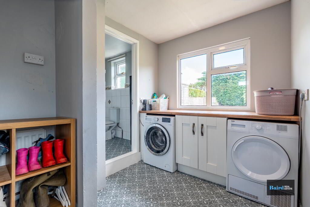 Vinyl flooring, Power points, Under counter storage, Plumbed for washing machine and space for dryer, pvc door to rear garden
