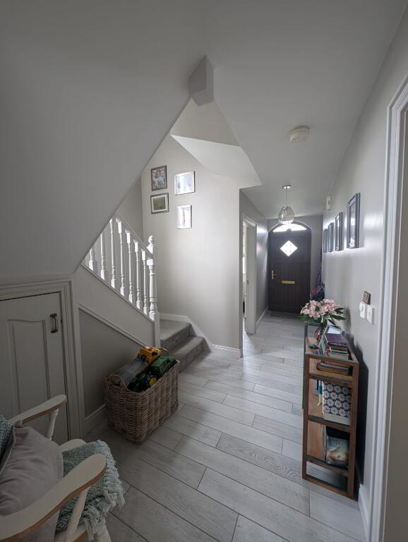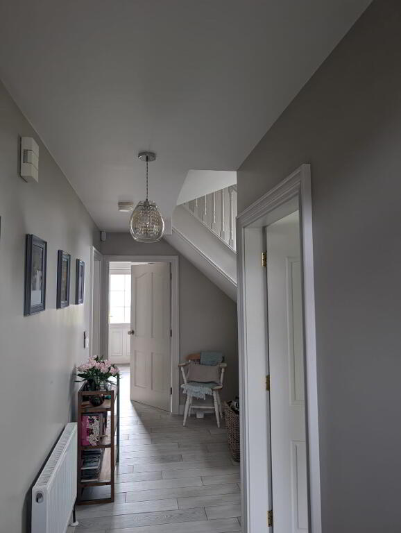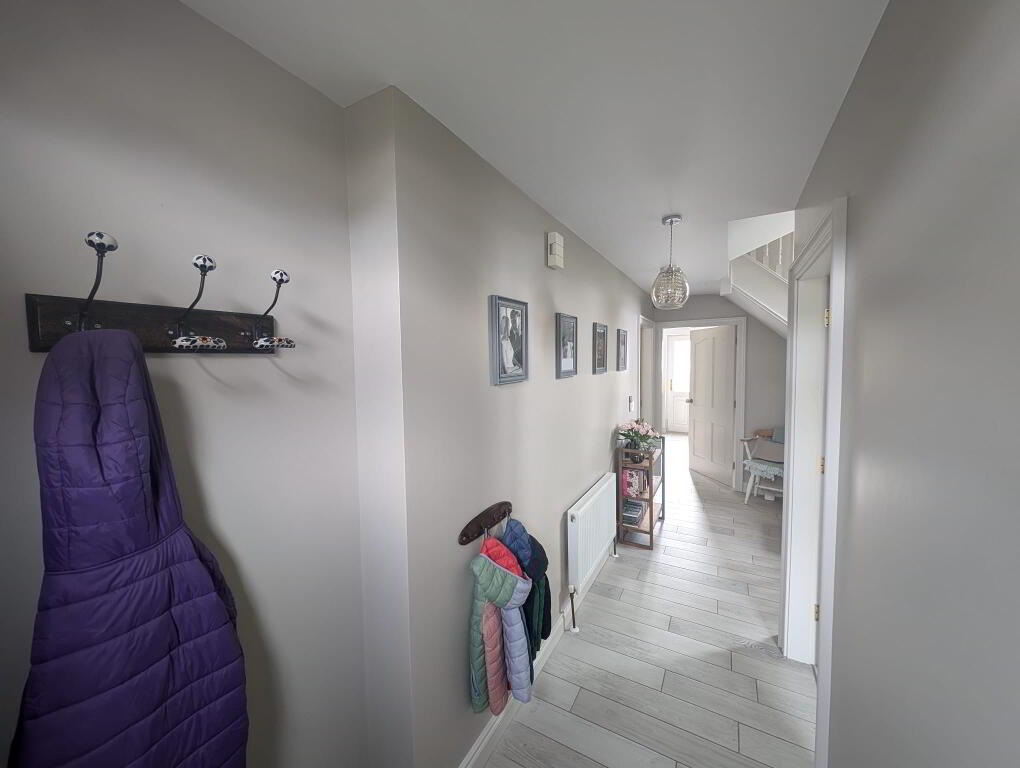 Tiled flooring, radiator, wood frame front door, power points, leading to stairway which is carpeted, under stairs storage, power points.