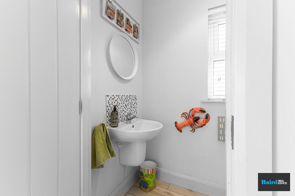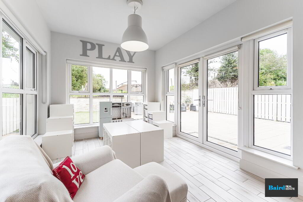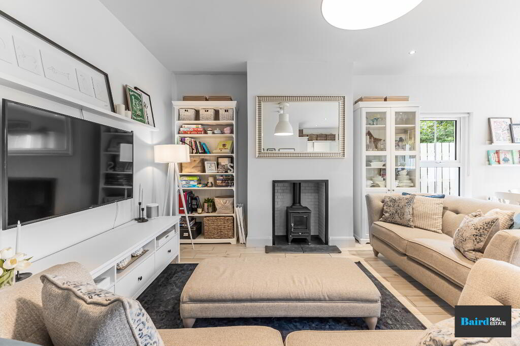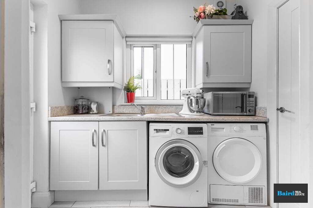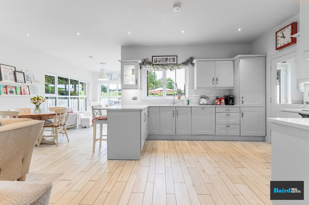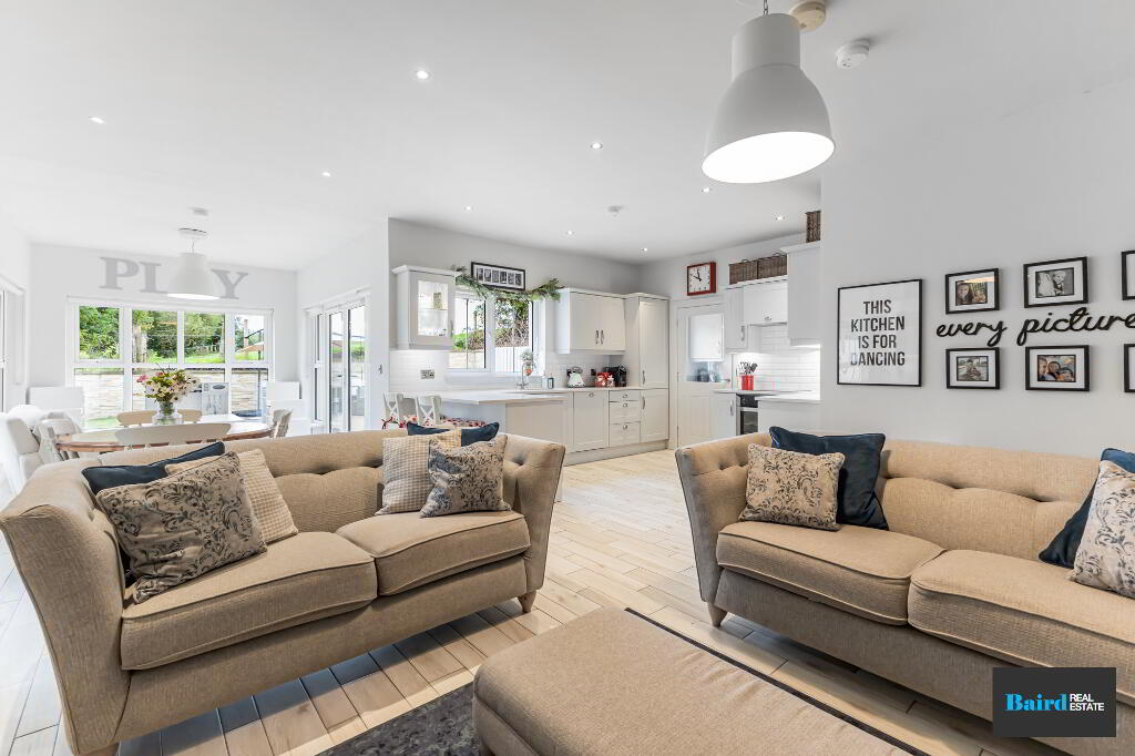 Internally, the property is finished to a high standard and benefits from gas heating. The ground floor comprises a spacious living room with feature stove, a stylish WC, utility room, and an exceptional open-plan kitchen, living, and dining space – the heart of the home and perfect for modern family living and entertaining.