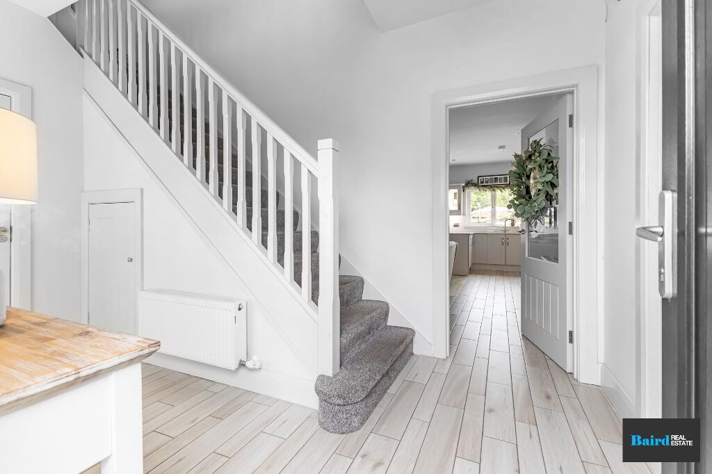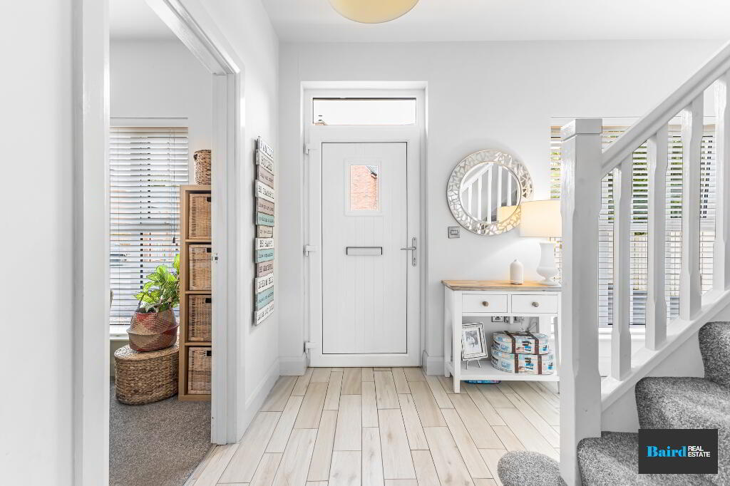 Pvc door with glazed panel, Wood effect tiled flooring, double panel radiator, under stair storage.