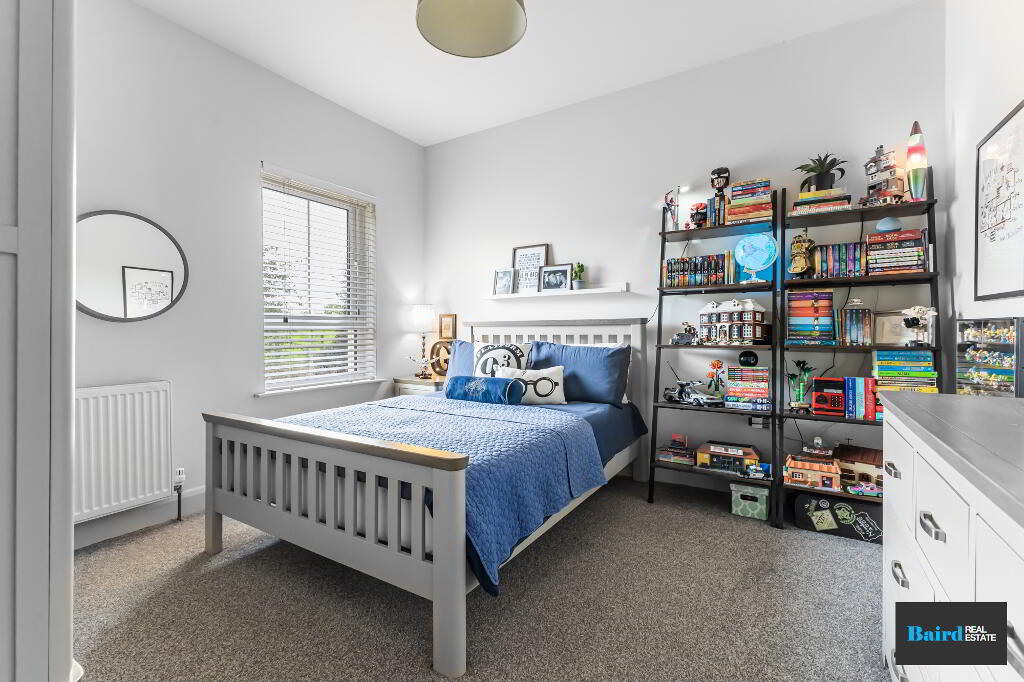 Carpet flooring, double panel radiator, power points and TV point, rear aspect window.