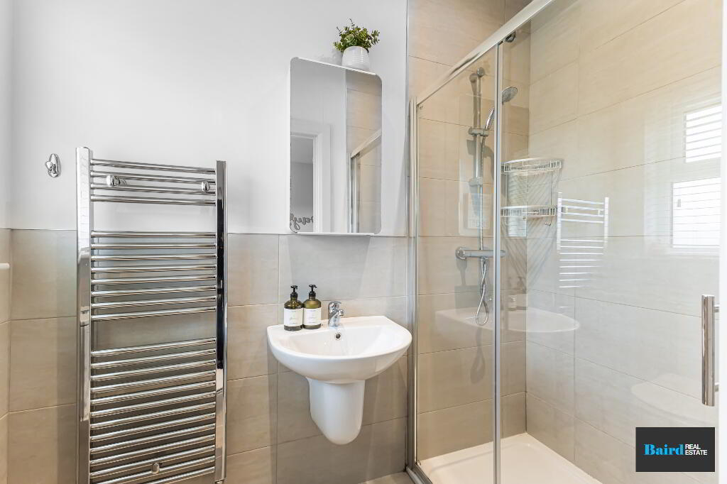 Tiled flooring and half tiled walls, low flush WC and floating wash hand basin, mains shower, chrome towel radiator, ceiling spotlights,extractor fan.