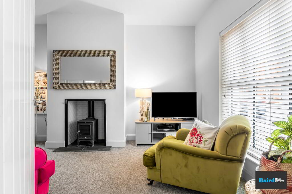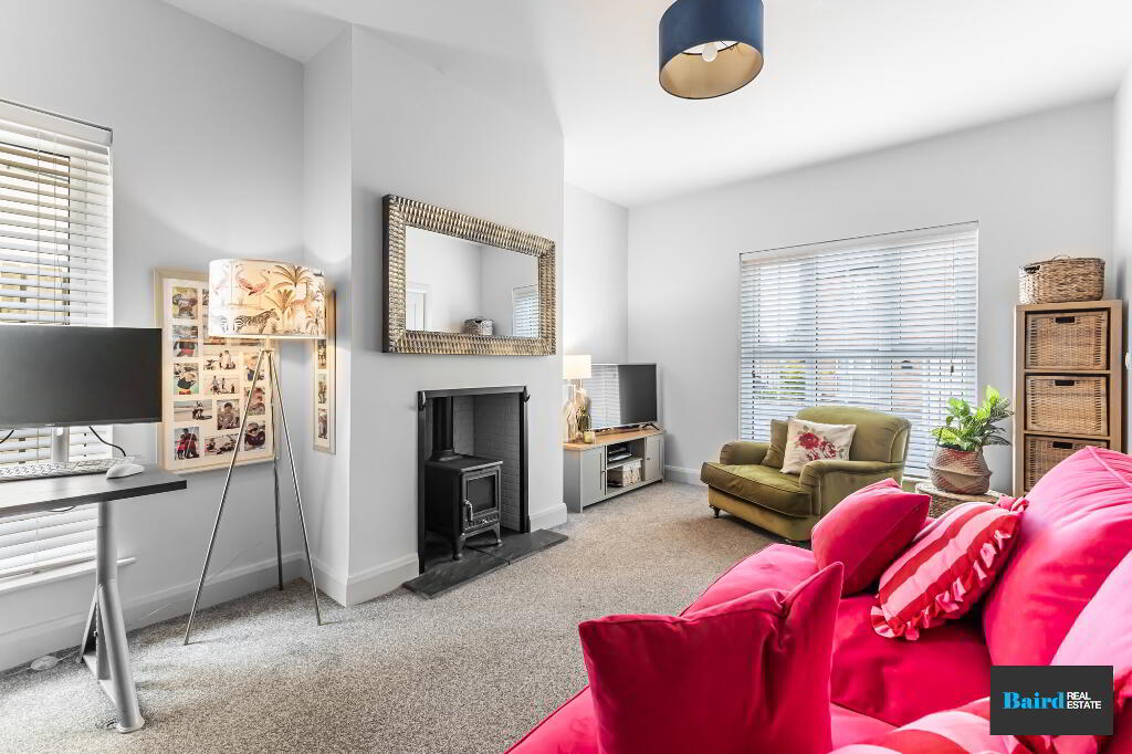 Carpet flooring, multi-fuel stove with tiled inset and slate hearth, double panel radiator, front and side aspect windows, power points and TV point..