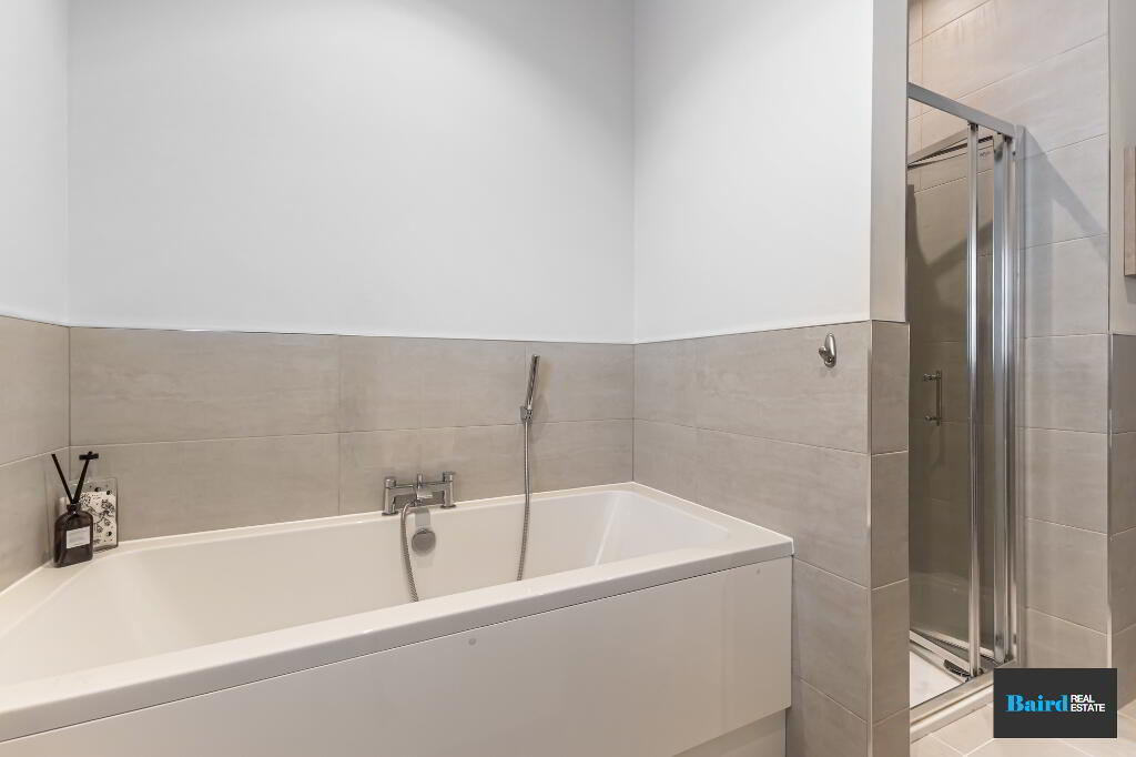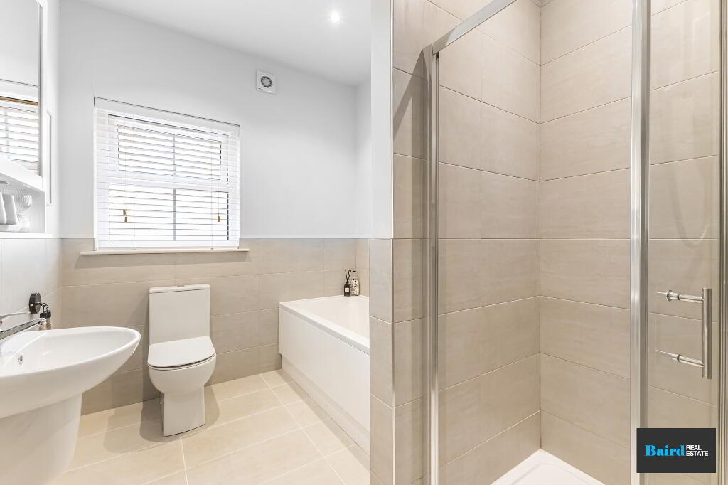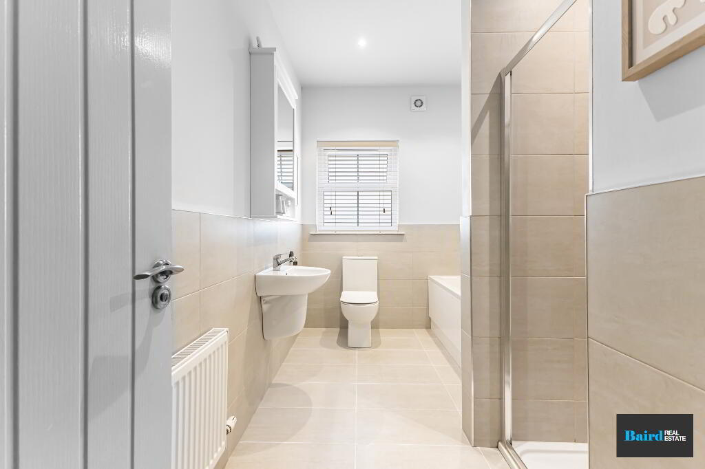 Tiled flooring, low flush WC, floating wash hand basin, white panel bath with mixer taps, Triton electric shower, half tiled walls, ceiling spotlights, extractor fan.