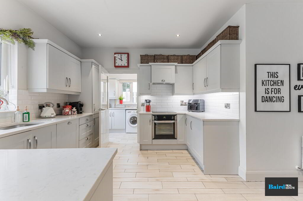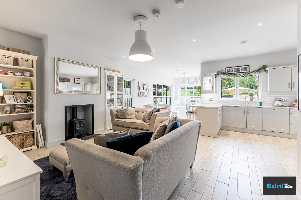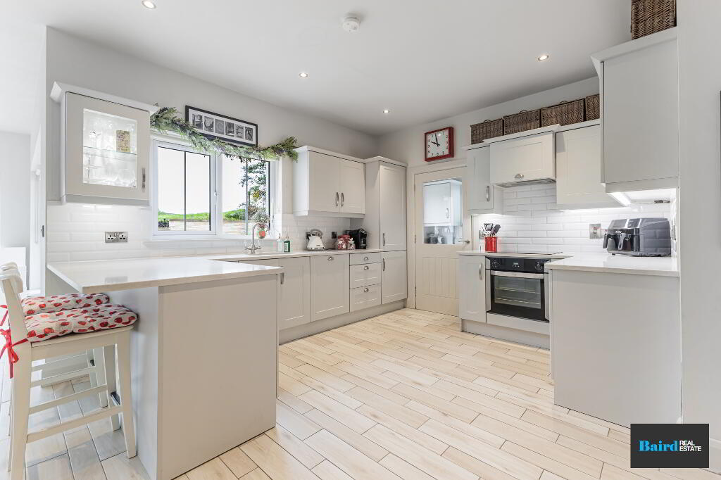 Wood effect tiled flooring, range of high and low level cupboards and display units, Belling oven, grill and counter top hob, integrated fridge freezer, Beko integrated dishwasher, 1.5 bowl sink, quartz worktops with breakfast bar, tiled between units, Multi-fuel stove and tiled inset, power points and TV point, two double panel radiators, ceiling spotlights, pvc patio doors leading to paved patio area.