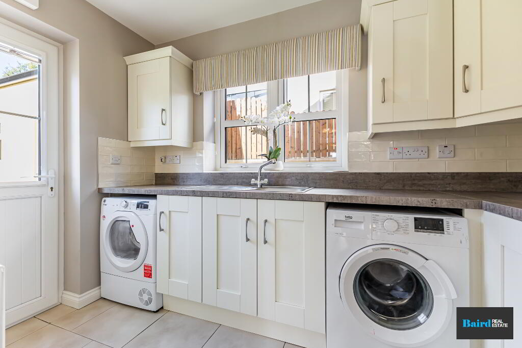 Tiled splashback, plumbed for washing machine and space for dryer, high and low level storage units, 1 bowl stainless steel sink, tiled splashback, extractor fan, Pvc door to back garden, single panel radiator.