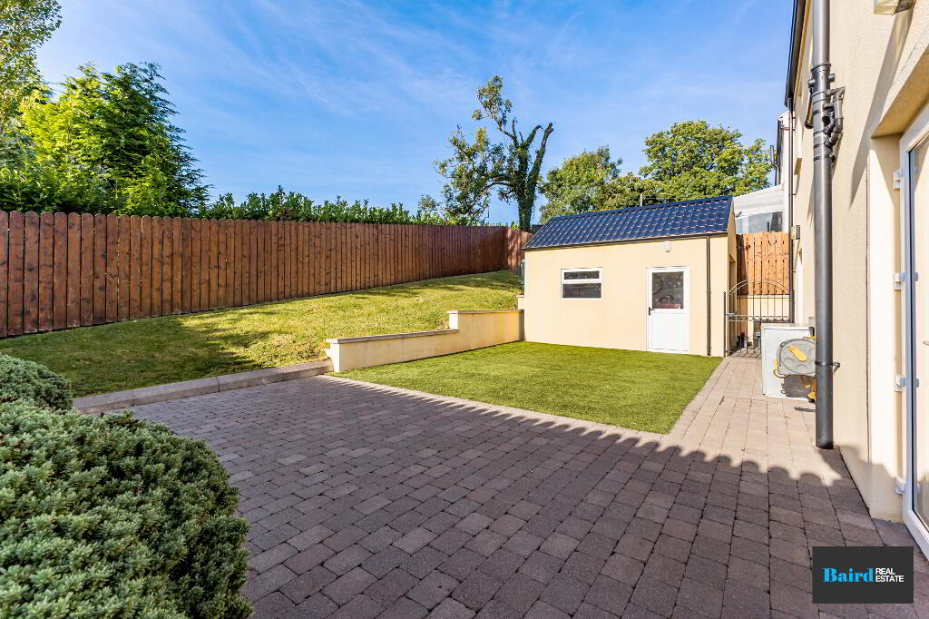 Rear Paved patio area, Lawn in artificial grass, bedded area with wood chip and sleepers, elevated lawn in grass, outside water tap, two galvanised and coated iron gates enclosing back garden, sensor lights on outside of the house.