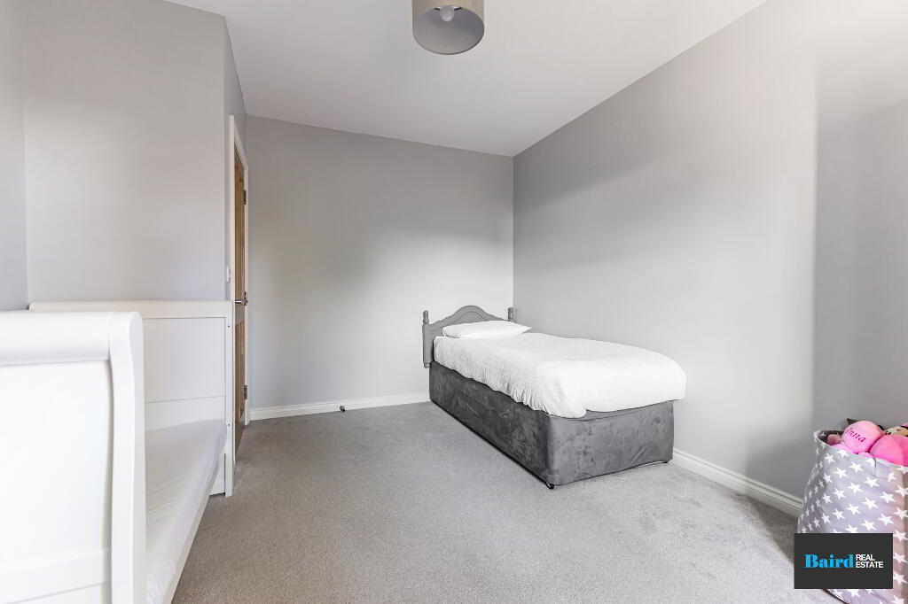 Carpeted, double panel radiator, power points, integrated mirrored slide robes.
