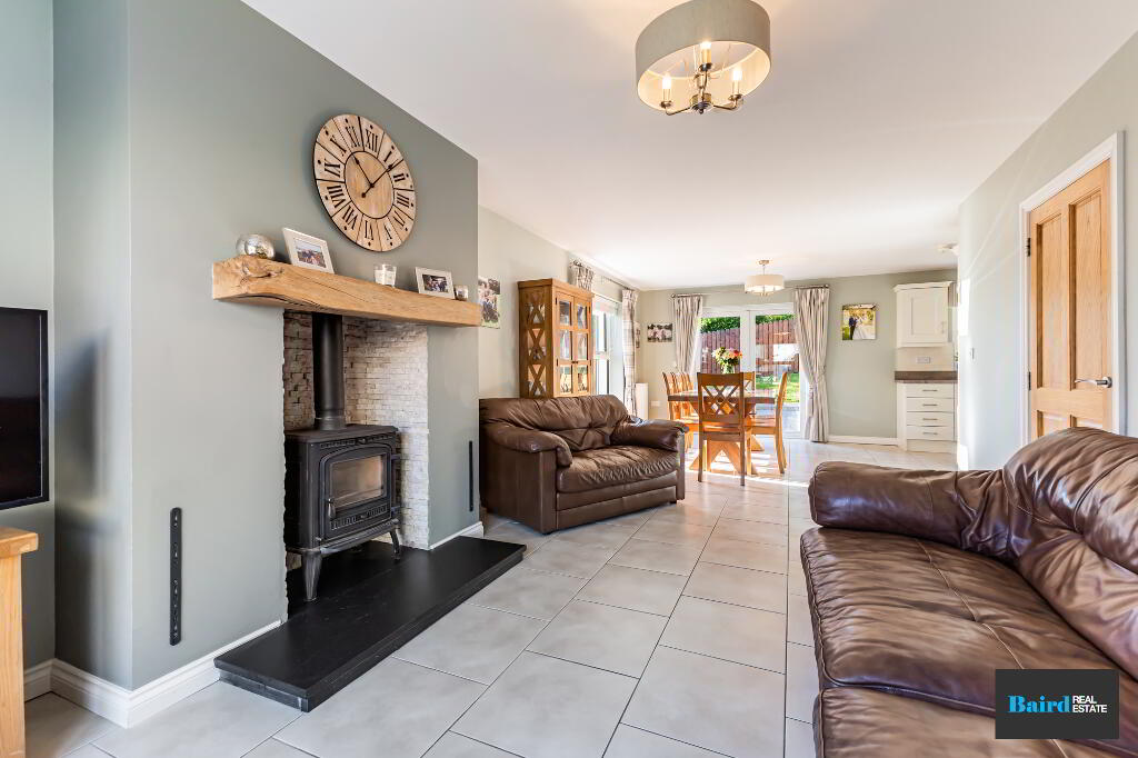 Tiled flooring, two double panel radiators, power points, TV point, fireplace with slate hearth, stone clad inset on wall and wooden mantle, wood burning stove, double patio Pvc doors to back garden, opens up to the kitchen.