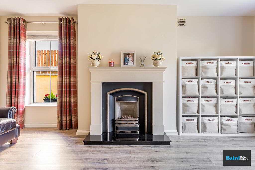 Wood effect tiled flooring,power points, TV point, double panel radiator, open fireplace with granite hearth and surround and cast inset.