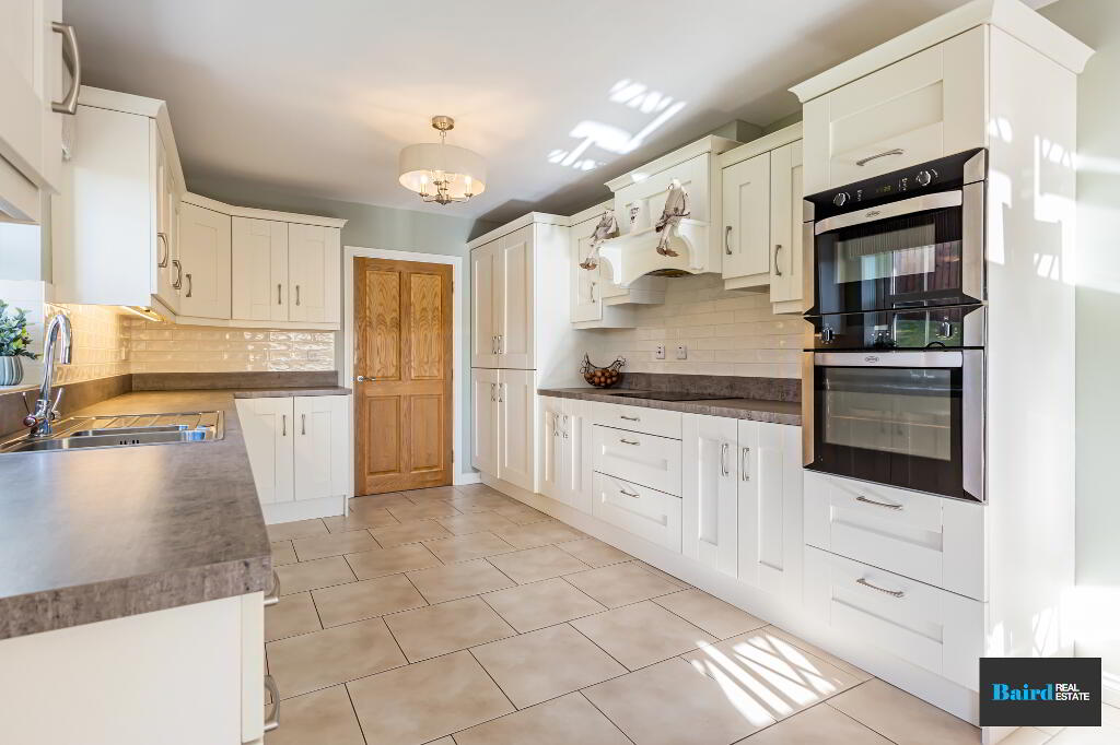 Range of high and low level kitchen storages units, Belling electric fan oven, Belling combo microwave and oven, four ring Belling electric hob, extractor hood, Full height integrated fridge freezer and larder, integrated Beko dishwasher, fitted under counter bin, 1.5 bowl stainless steel sink, tiled splashback, undercounter lights.