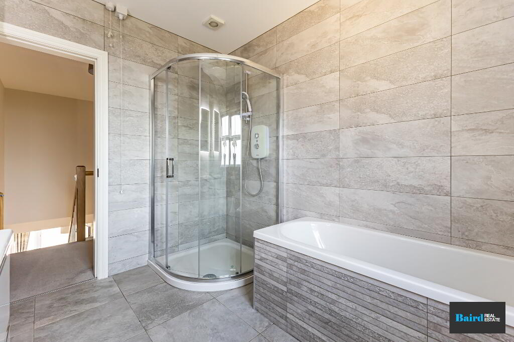 Tiled flooring, fully tiled walls, double panel radiator, wall mounted chrome heated towel rail, white ceramic WC and wash hand basin with vanity unit, wall mounted mirror with lighting, bath with tiled panel, corner shower with Redring electric shower units, extractor fan.