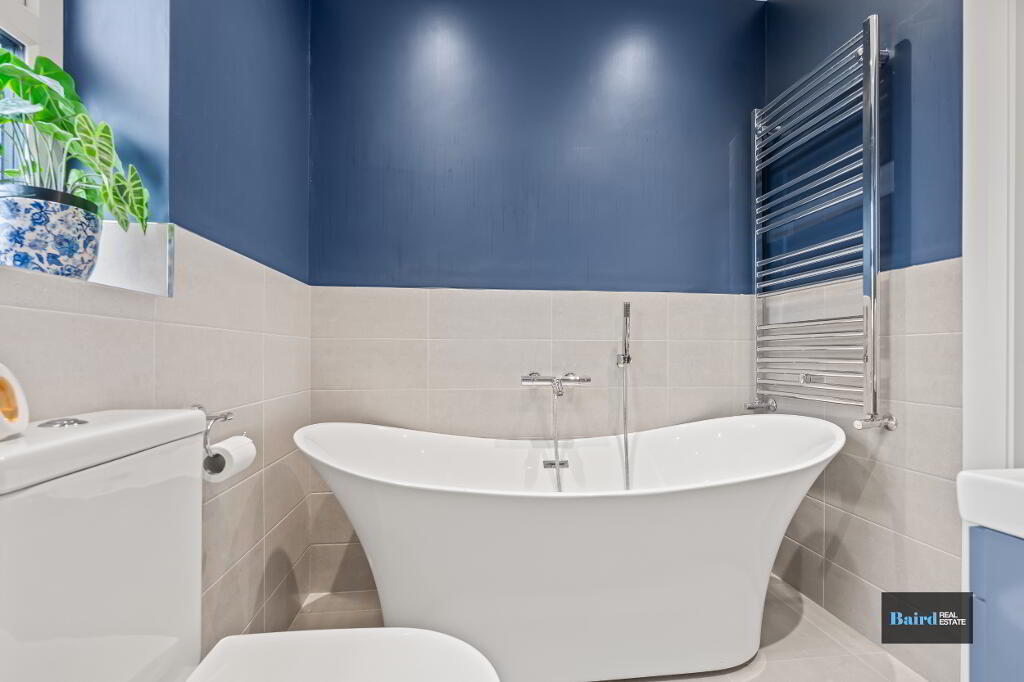 Tiled flooring, low flush wc and whb with floating vanity unit, freestanding bath with mixer taps and shower head, chrome towel radiator, power shower, half tiled walls, wall mounted electric mirror, extractor fan and ceiling spotlights.