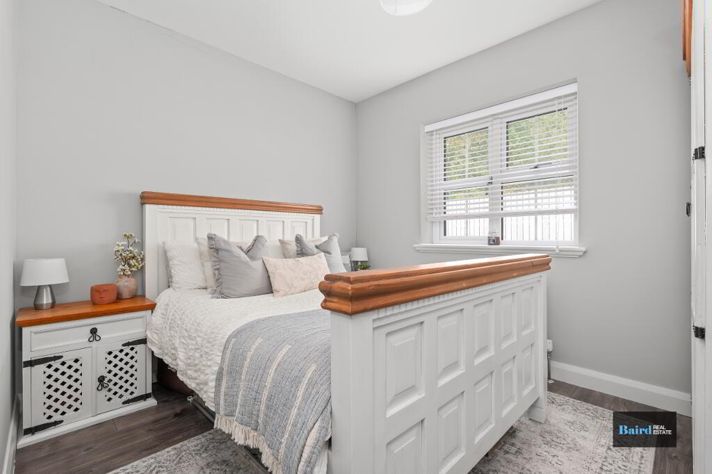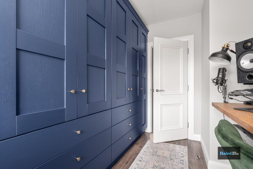 Laminate wooden flooring, built-in cupboard and drawers, double panel radiator, front aspect window, power points and TV point.
