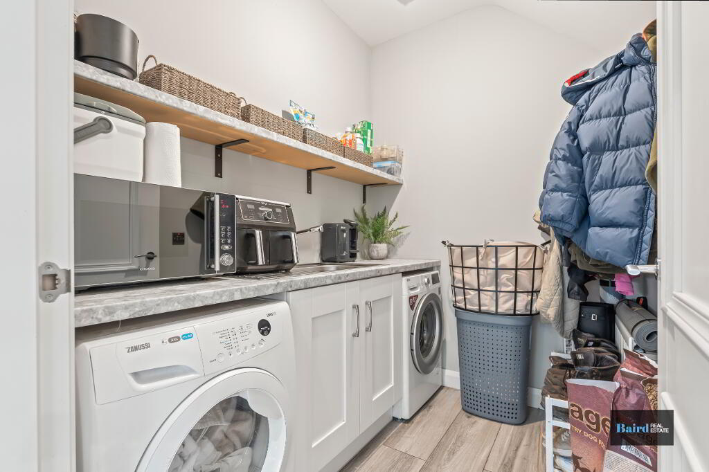 Wood effect tiled flooring, plumbed for washing machine and space for tumble dryer, storage cupboards and shelving, double panel radiator and extractor fan.