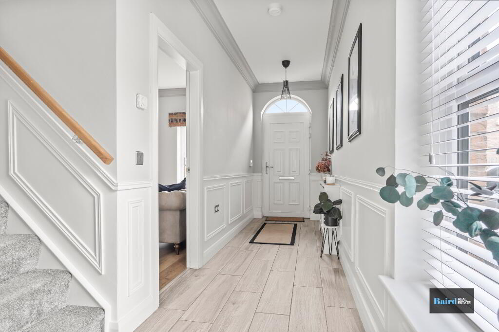Pvc door with fan light, wood effect tiled flooring, wooden panelling to walls, coving on ceiling, intruder alarm, thermostat and double panel radiator.
