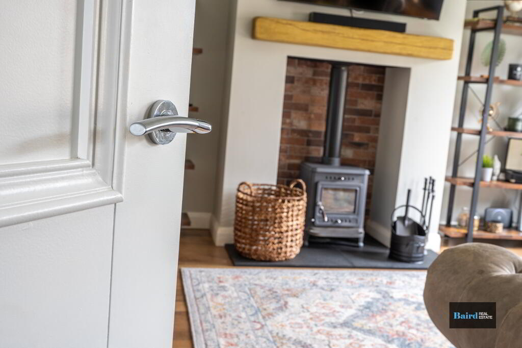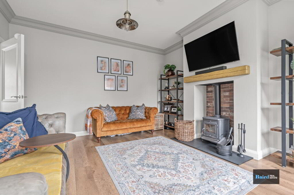 Laminate wooden flooring, ceiling coving ,multi-fuel stove, power points and TV point, two front aspect windows and double panel radiator.