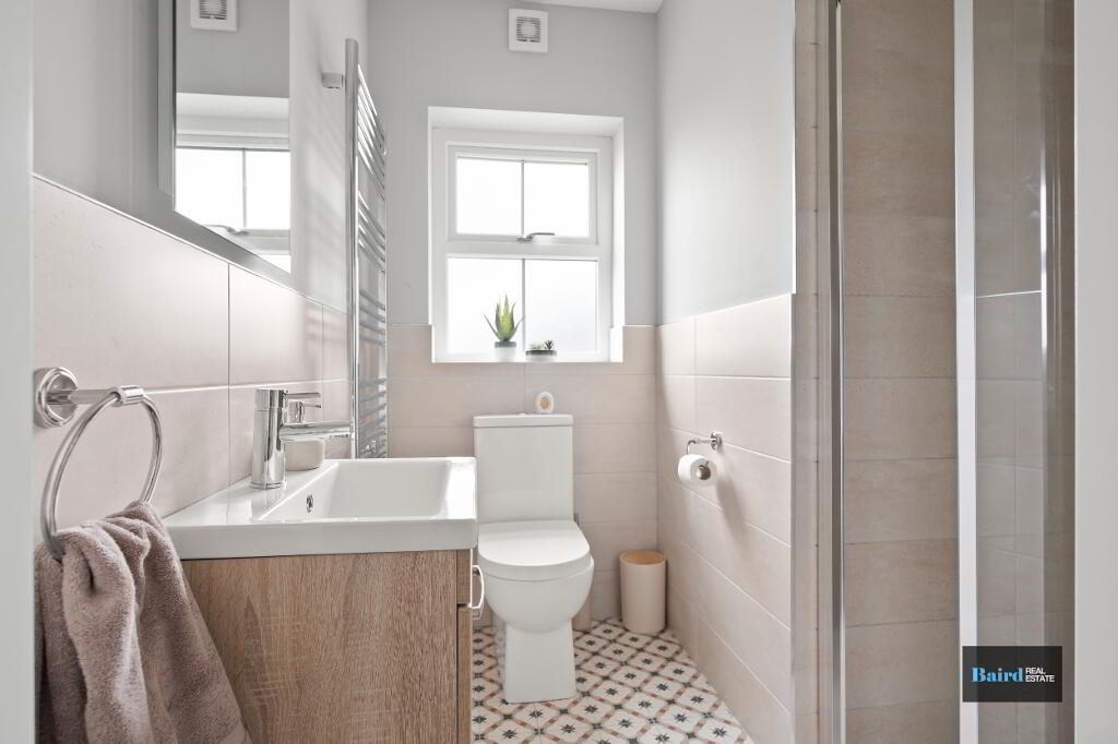 Tiled flooring, low flush WC and wash hand basin with vanity unit, chrome towel radiator and extractor fan.