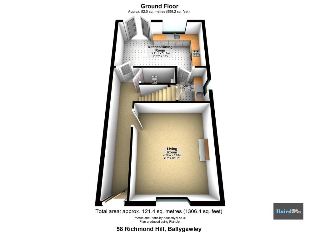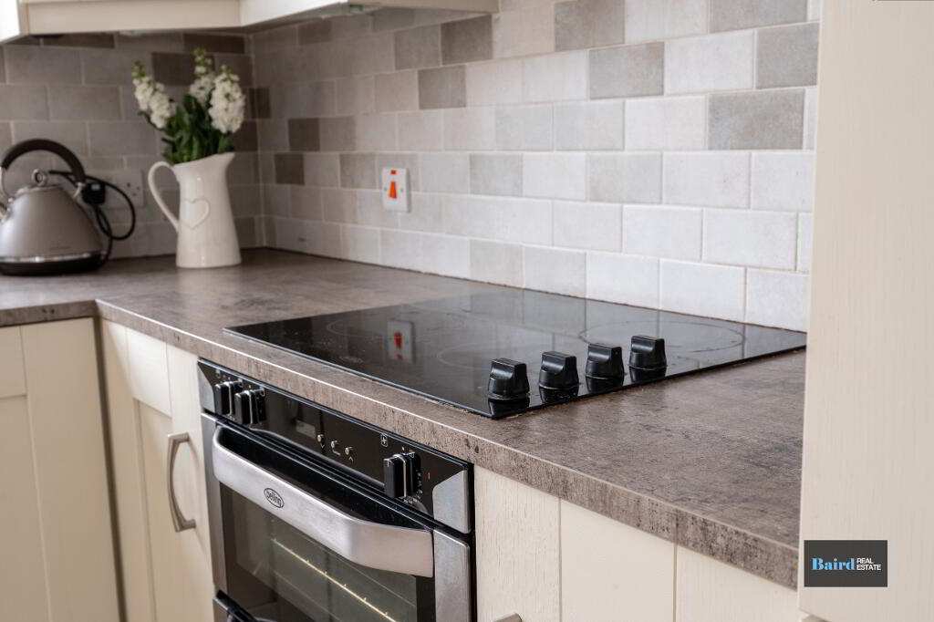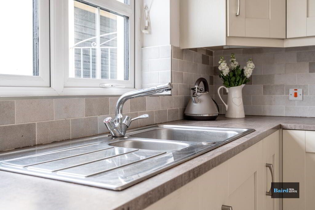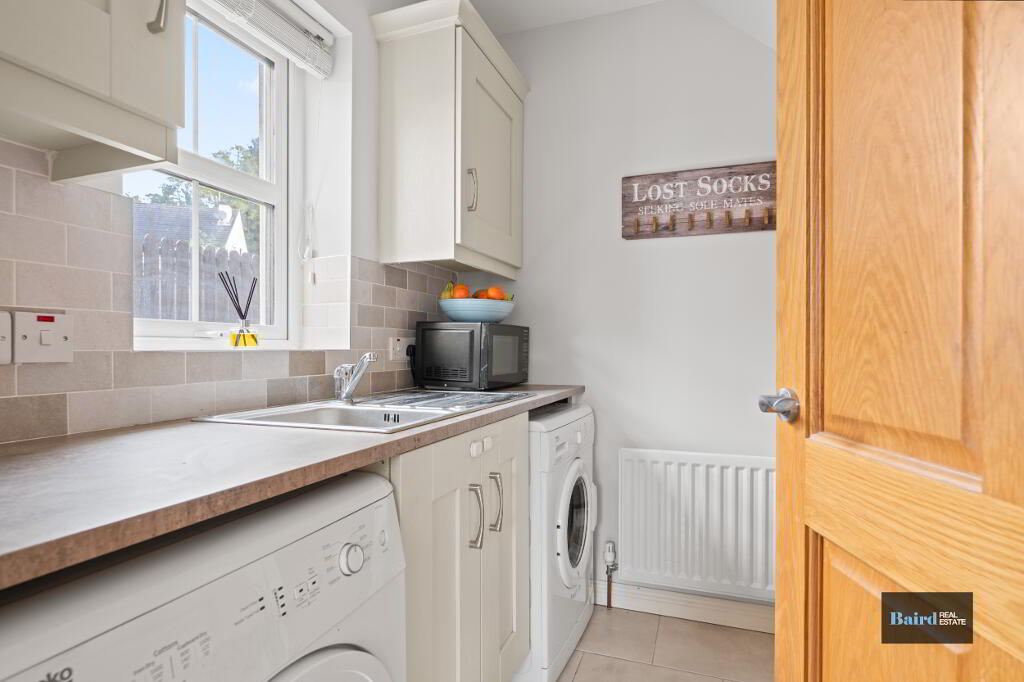 Tiled flooring, range of high and low level storage units, 1 bowl stainless steel sink, plumbed for washing machine and dryer, tiled splashback, power points, single panel radiator and storage under stairs.