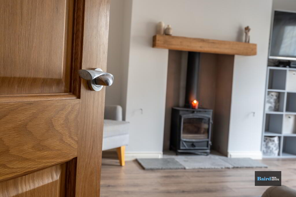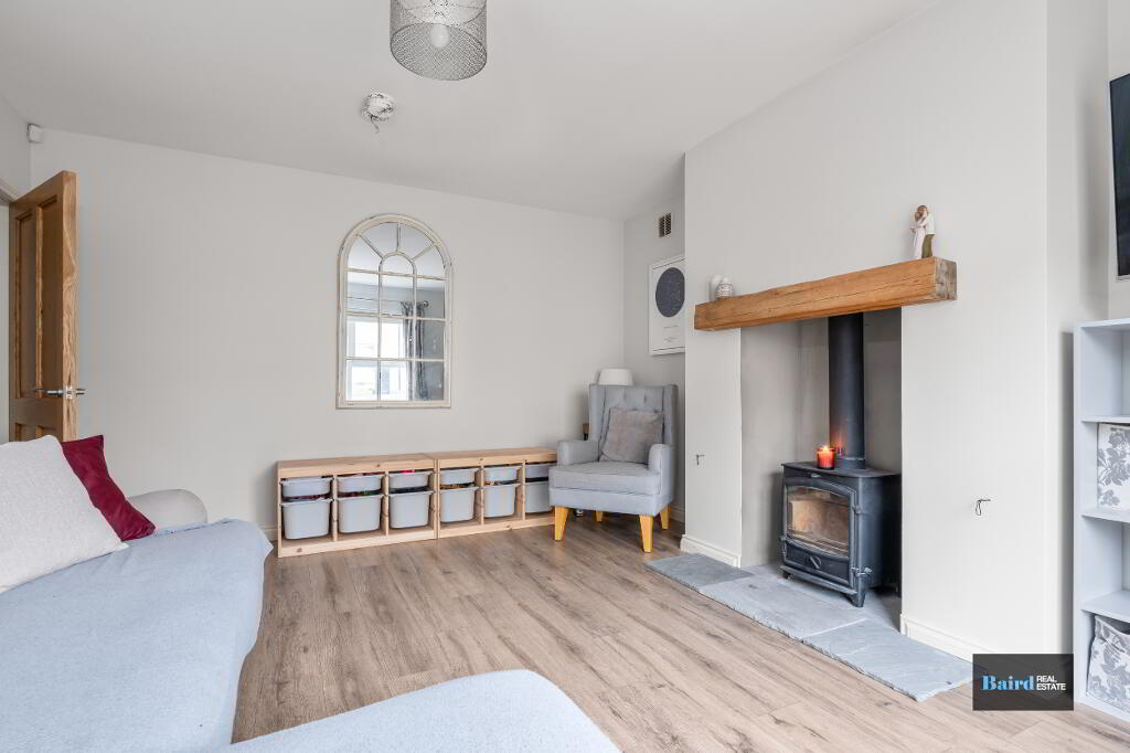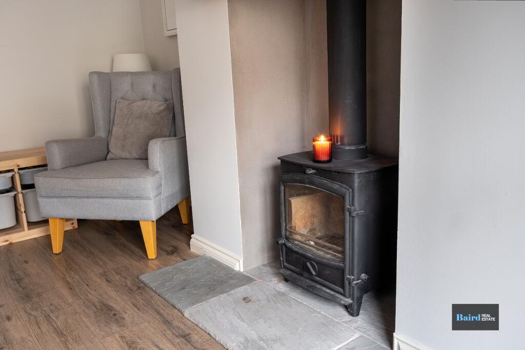 Laminate flooring, power points, TV point, wood burning stove with slate hearth and wooden mantle.