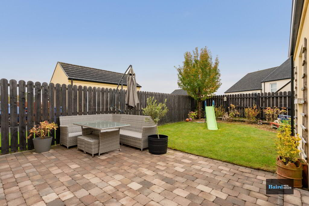 Paved patio area, garden in lawn with stoned bedded area, outside water tap and gate to enclose garden.