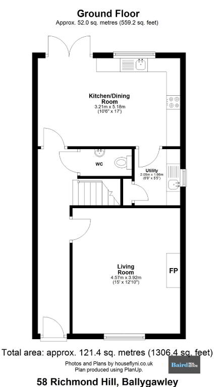 The ground floor comprises a bright entrance hallway, a spacious living room featuring a wood-burning stove, a convenient downstairs WC, and an impressive open plan kitchen and dining area — ideal for family life and entertaining. A separate utility room adds practicality and functionality.