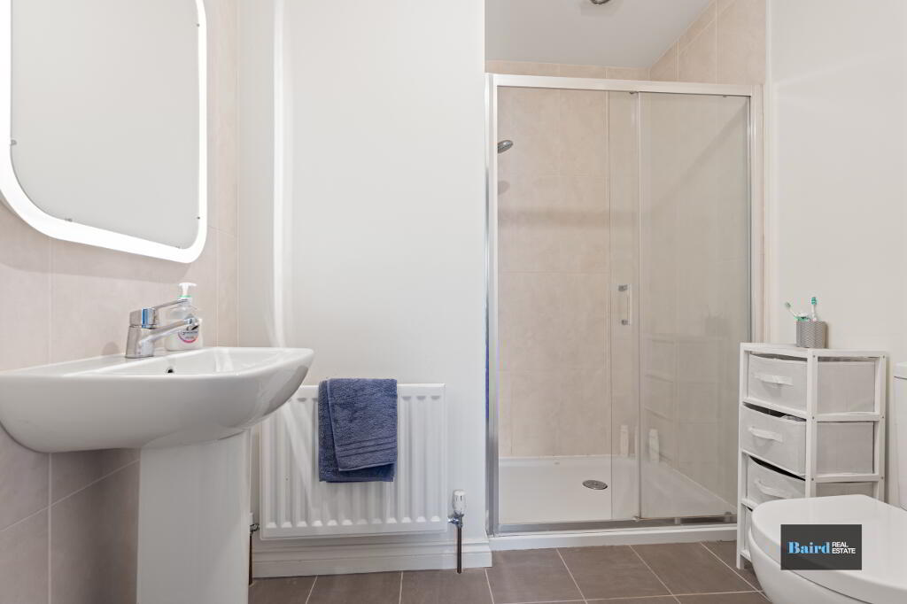 Tiled flooring, corner shower with redring electric shower unit, bath, tiled splashback at bath, double panel radiator, white ceramic WC and wash hand basin, tiled splashback to ceiling, extractor fan.