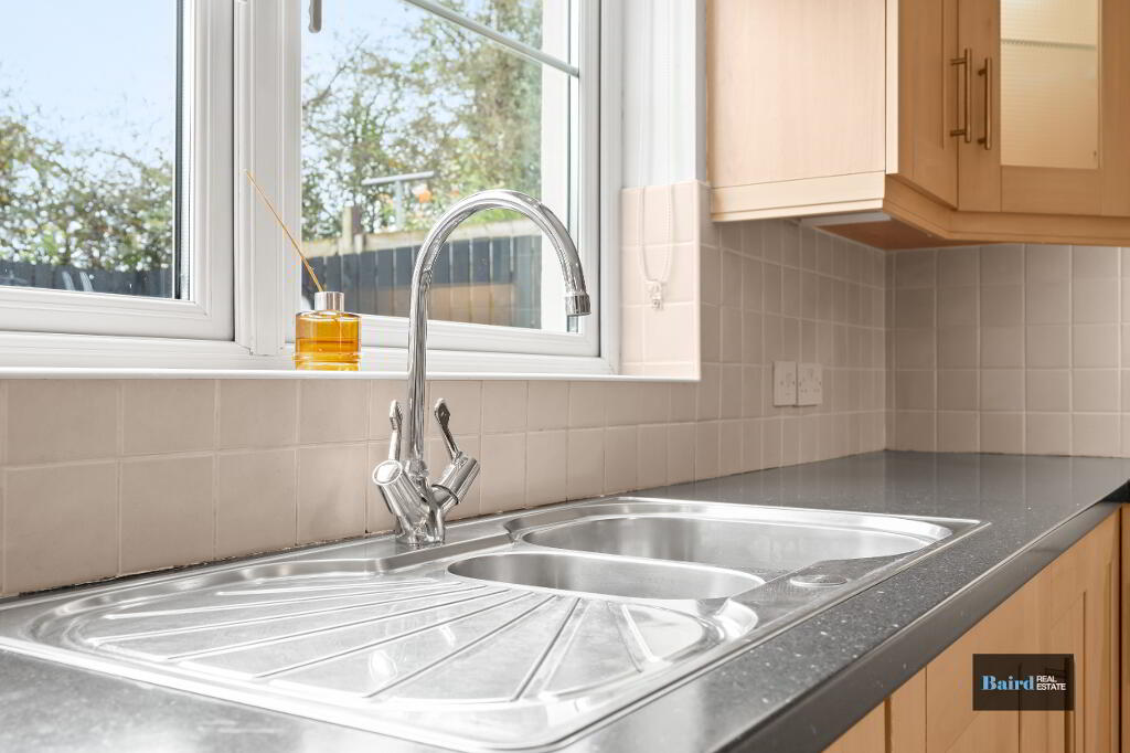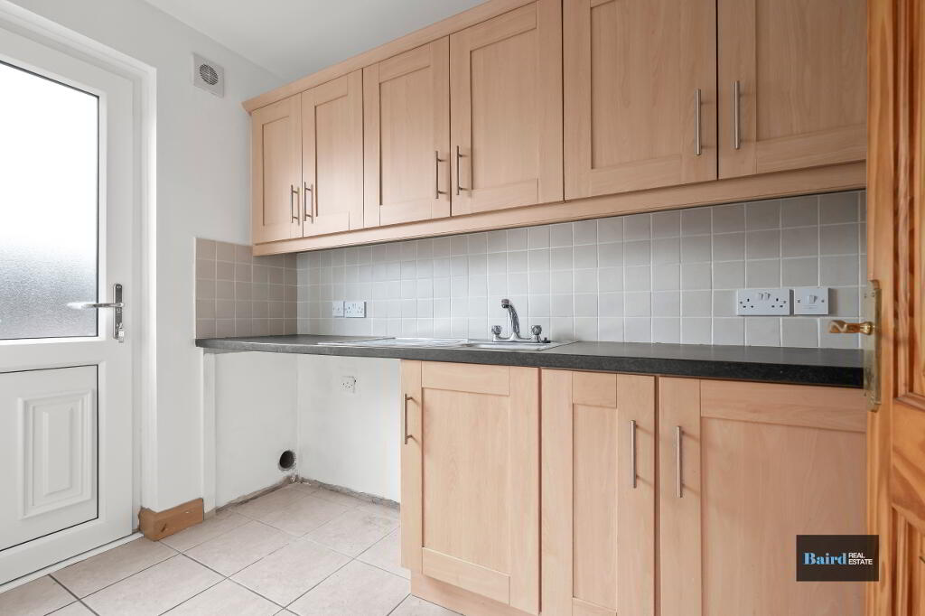 Tiled flooring, single panel radiator, pvc door to side yard. Range of high and low level storage units, plumbed for washing machine and space for dryer, 1 bowl stainless steel sink, tiled splashback, extractor fan.