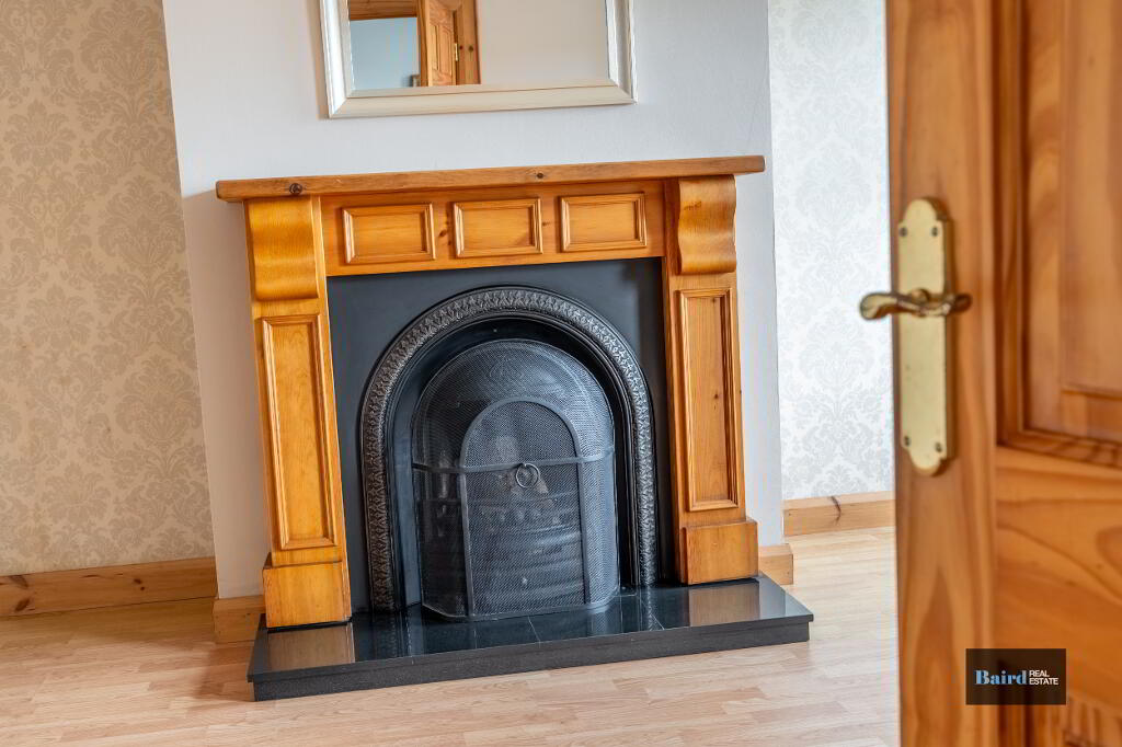Laminate flooring, single panel radiator, power points, tv point, open fireplace with granite hearth and wooden surround.