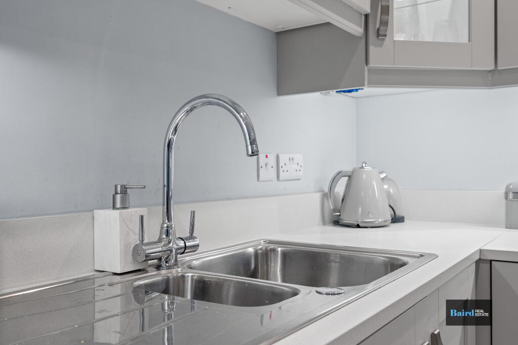 Polished tiled flooring, range of high and low level kitchen storage units, double panel radiator, kick board spot lights, integrated indesit dishwasher, 1.5 bowl stainless steel sink, integrated fridge and freezer, integrated indesit electric fan oven and four ring electric hob, extractor hood and tiled splashback.